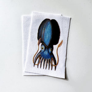 A blue squid marine animal patch for your jacket, vest, shirt, backpack, or bag. It's rectangular in shape and measures approx 2.5x3.5" wide. The size will vary as they are cut by hand.