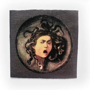 This is a fabric printed patch for your jacket, vest, shirt, backpack, or bag. It measures approximately 3x3". It features an oil on canvas painting by Cavaggio. Done in 1597, it depicts Medusa with her head no longer attached.