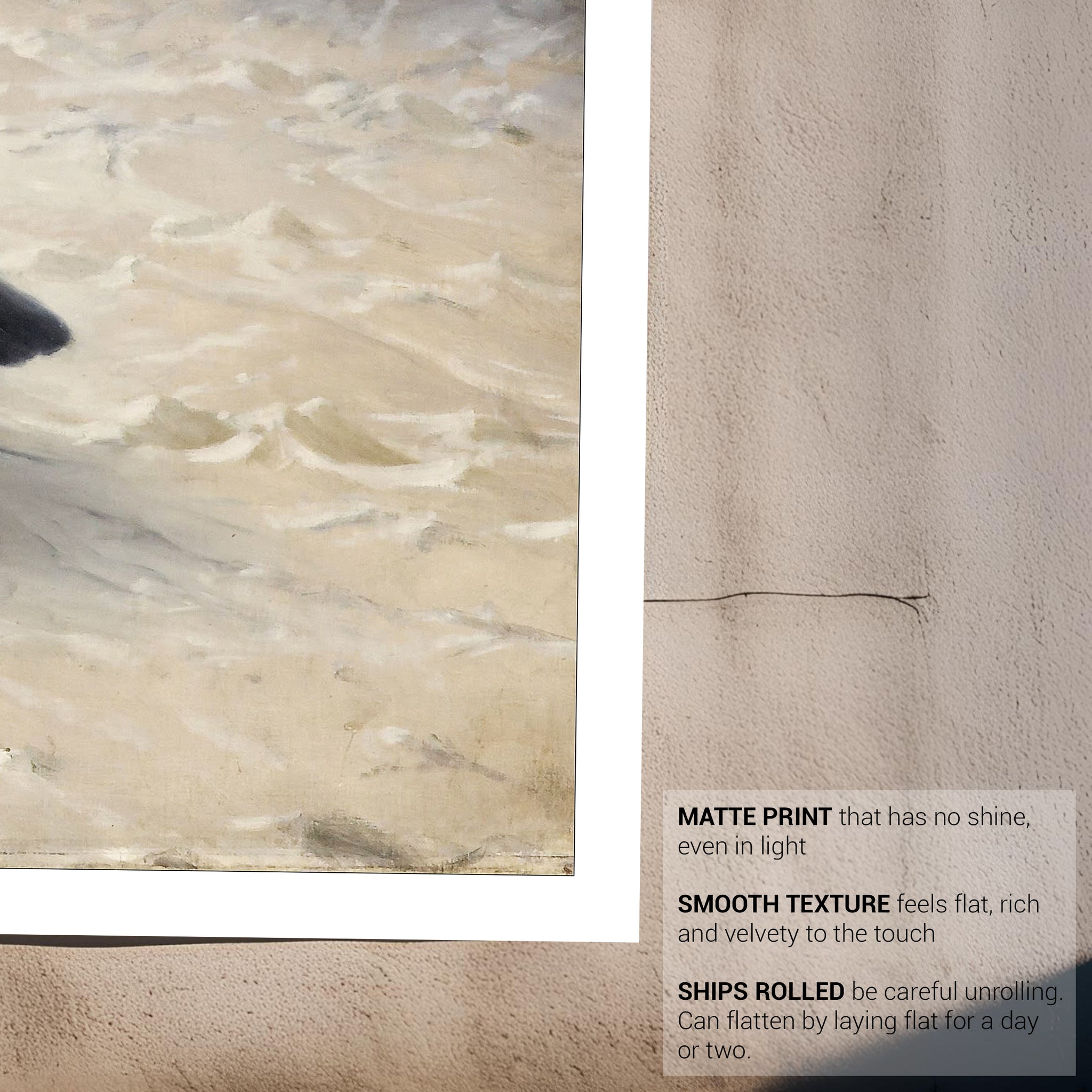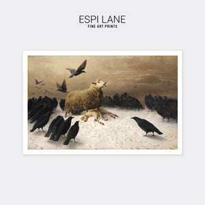 This moody and deeply emotional oil painting by August Friedrich Albrecht Schenck has been printed on Archival Matte Paper. It is a famous oil painting of a mother and her lamb with crows waiting. It was painted in approx 1878 with oil on canvas. The colors are black, brown, beige, and cream. You will receive one (1) unframed print in your choice of size. It will be printed to order in 3-5 working days.