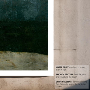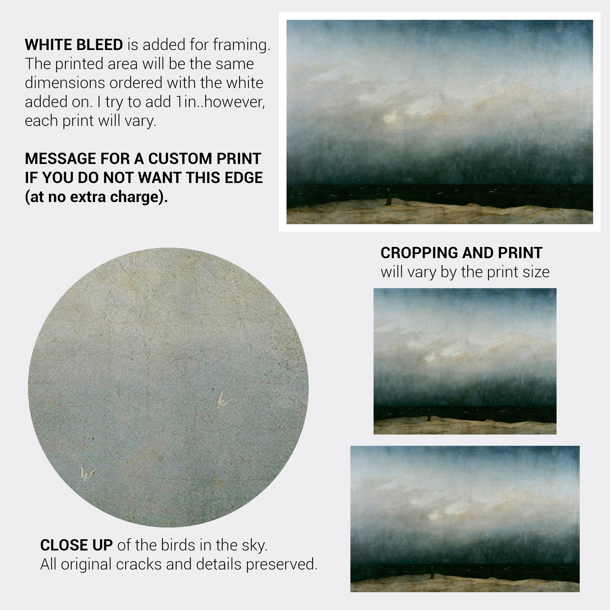 This is a high-quality wall art print of an oil painting showing a monk by the sea. It has a soft, dark palette with brown, beige, black, green, blue, and cream colors. Made in the 1800s, this emotional work is ideal for minimalist and traditional living areas. You will receive one (1) unframed print in your choice of size.
