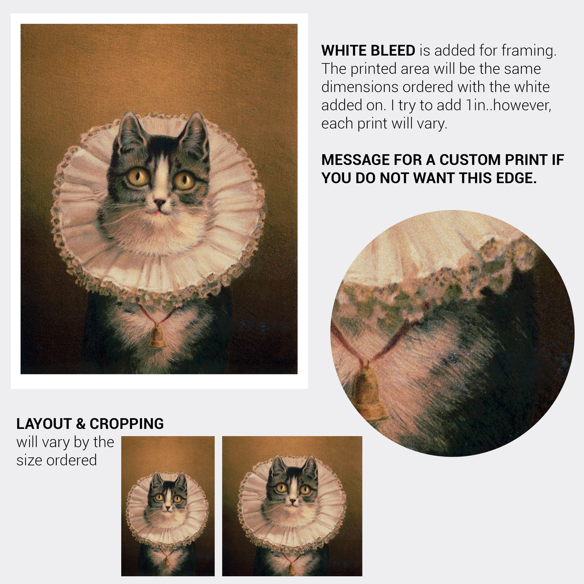 This is a high-quality wall art print on Matte Archival Paper. This is an oil painting from the 1860s of a cat wearing a frilly collar. The colors are neutral brown, gold, black, and beige colors. I restored and edited it into this variation as a unique fine art print. The frame is not included. You will receive one (1) unframed print in your choice of size. This is printed to order and will ship in 3-5 working days.