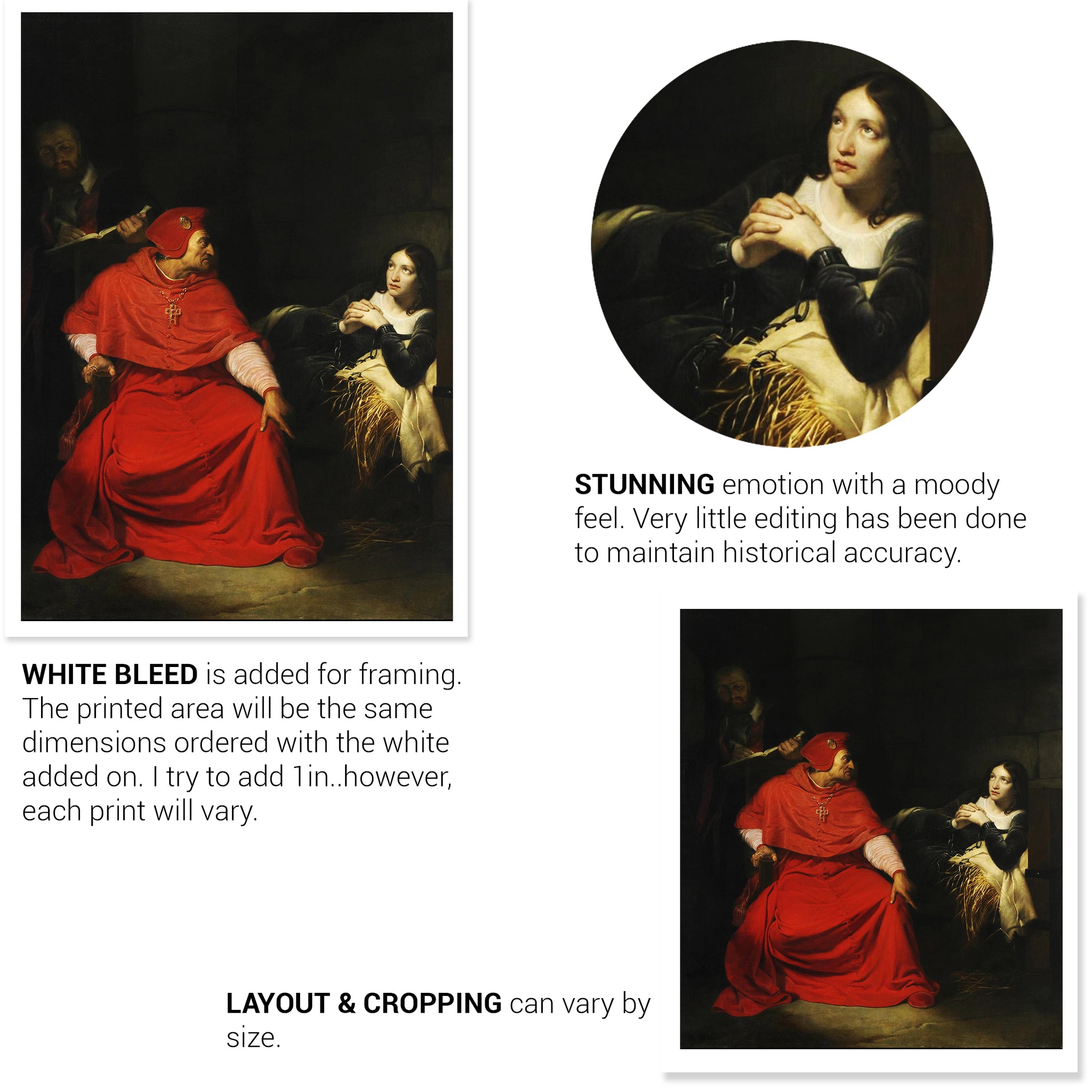 This is a high-quality wall art print on Matte Archival Paper. Completed in 1825, this painting depicts Joan of Arc imprisoned as her accuser, the cardinal points to hell. I edited the original into this variation. You will receive one (1) unframed print in your choice of size. This will be printed to order in 3-5 working days.