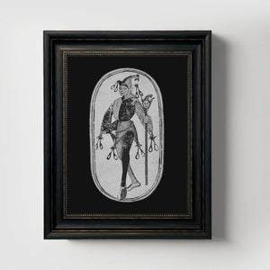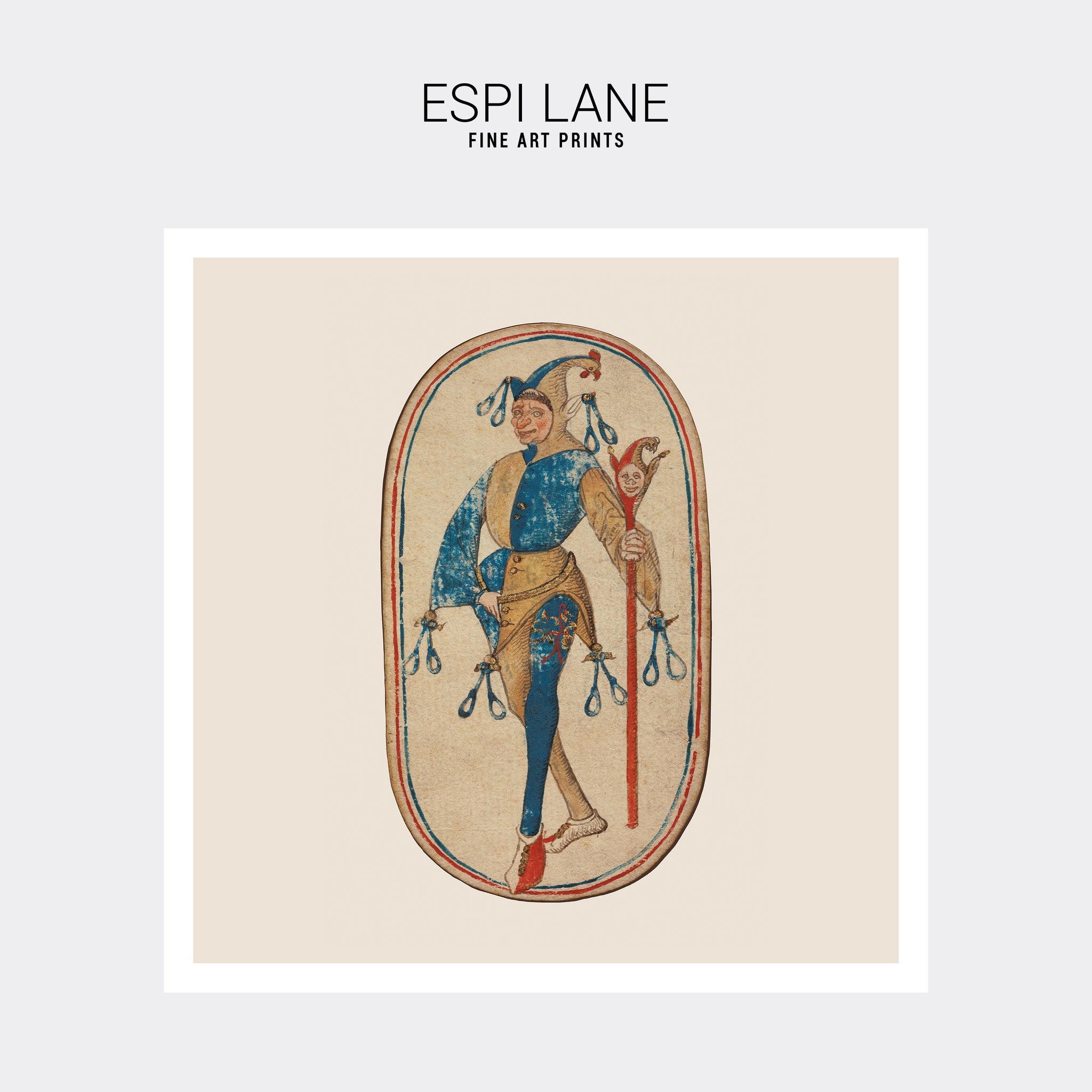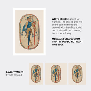 A high-quality wall art print on Matte Archival Paper. The jester is from a Dark Ages set of cards. I restored and edited the original to create these variations. Frame not included. You will receive one (1) unframed print in your choice of size and color.