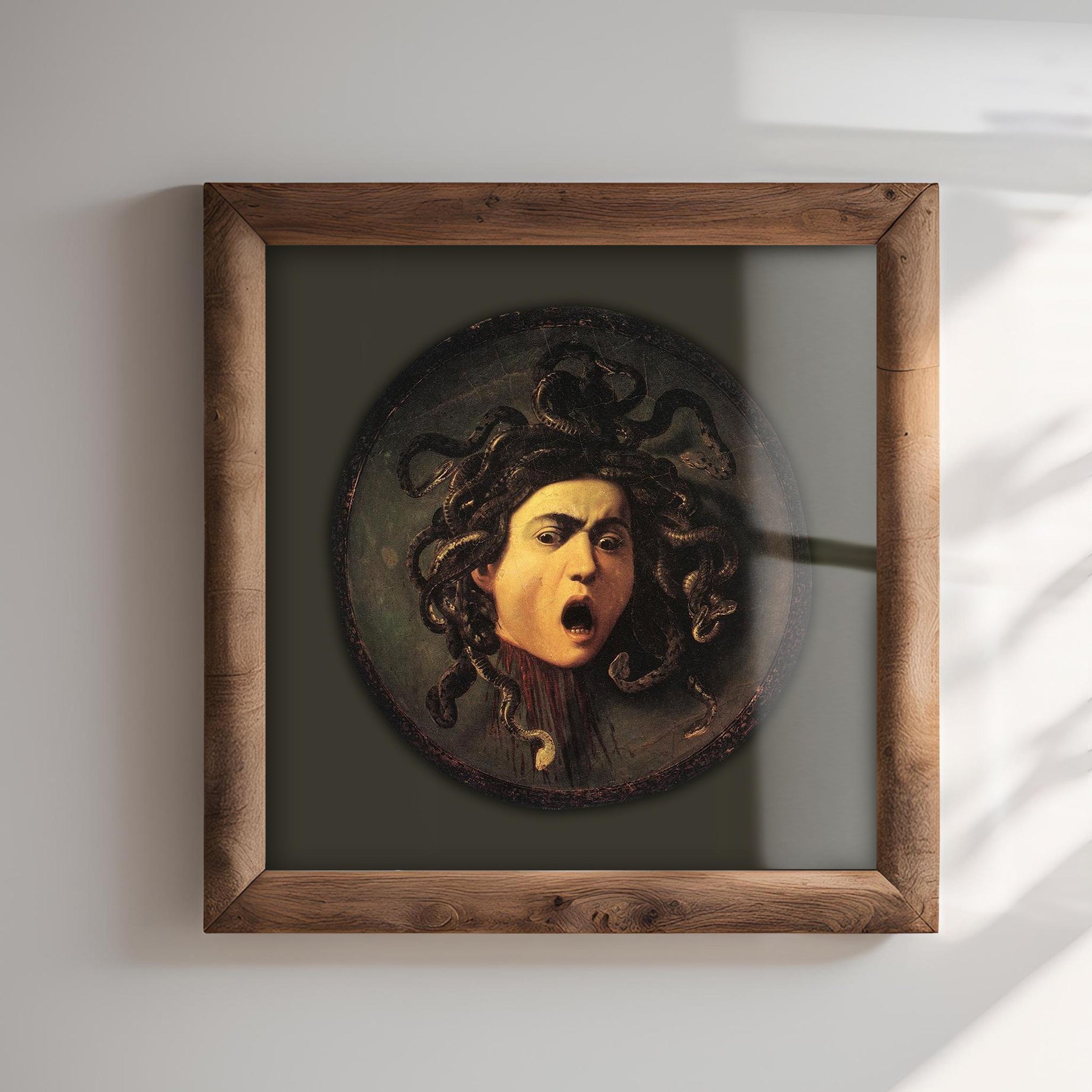 This is a 1597 oil on canvas by Michelangelo Merisi da Caravaggio of Medusa after Perseus "visited" her. It's been printed on high-quality Matte Archival Paper. The colors are olive-toned brown and black. The original painting has very warm, dark colors. You will receive one (1) unframed print in your choice of size.