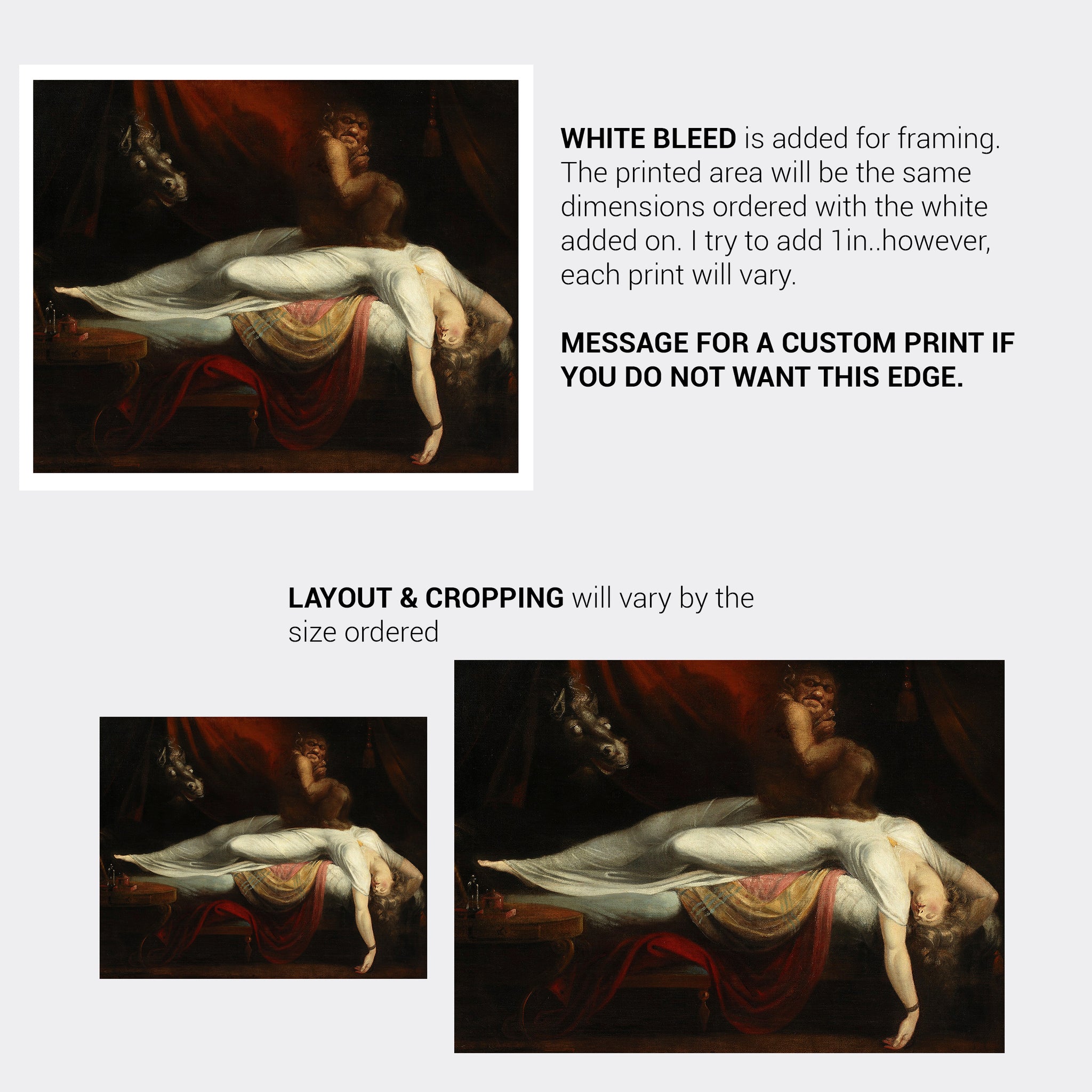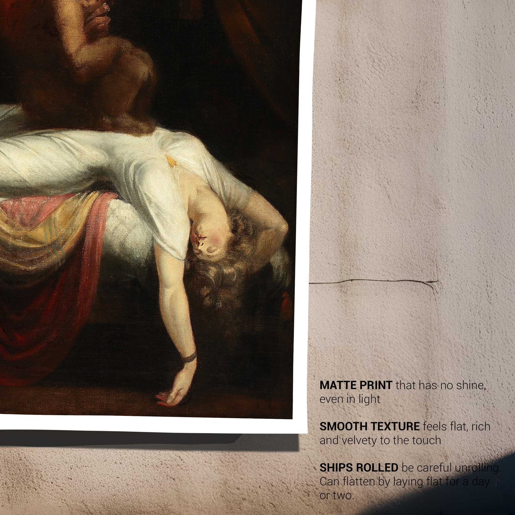 This is a high-quality wall art print on Matte Archival Paper. Completed in 1781, this painting depicts a woman on a bed having a nightmare while a demon sits on her. This work is an ideal example of Dark Romanticism. You will receive one (1) unframed print in your choice of size. This will be printed to order in 3-5 working days.
