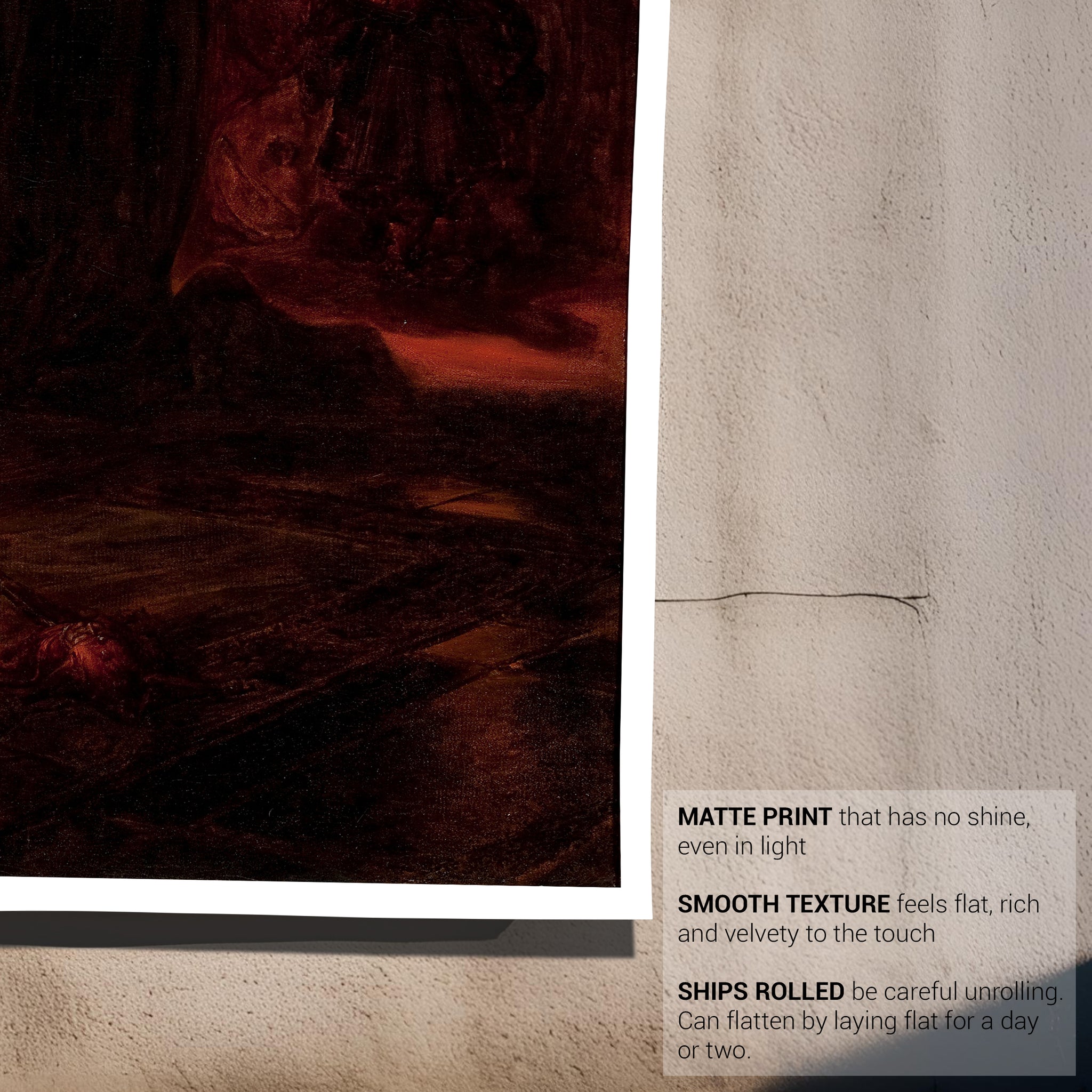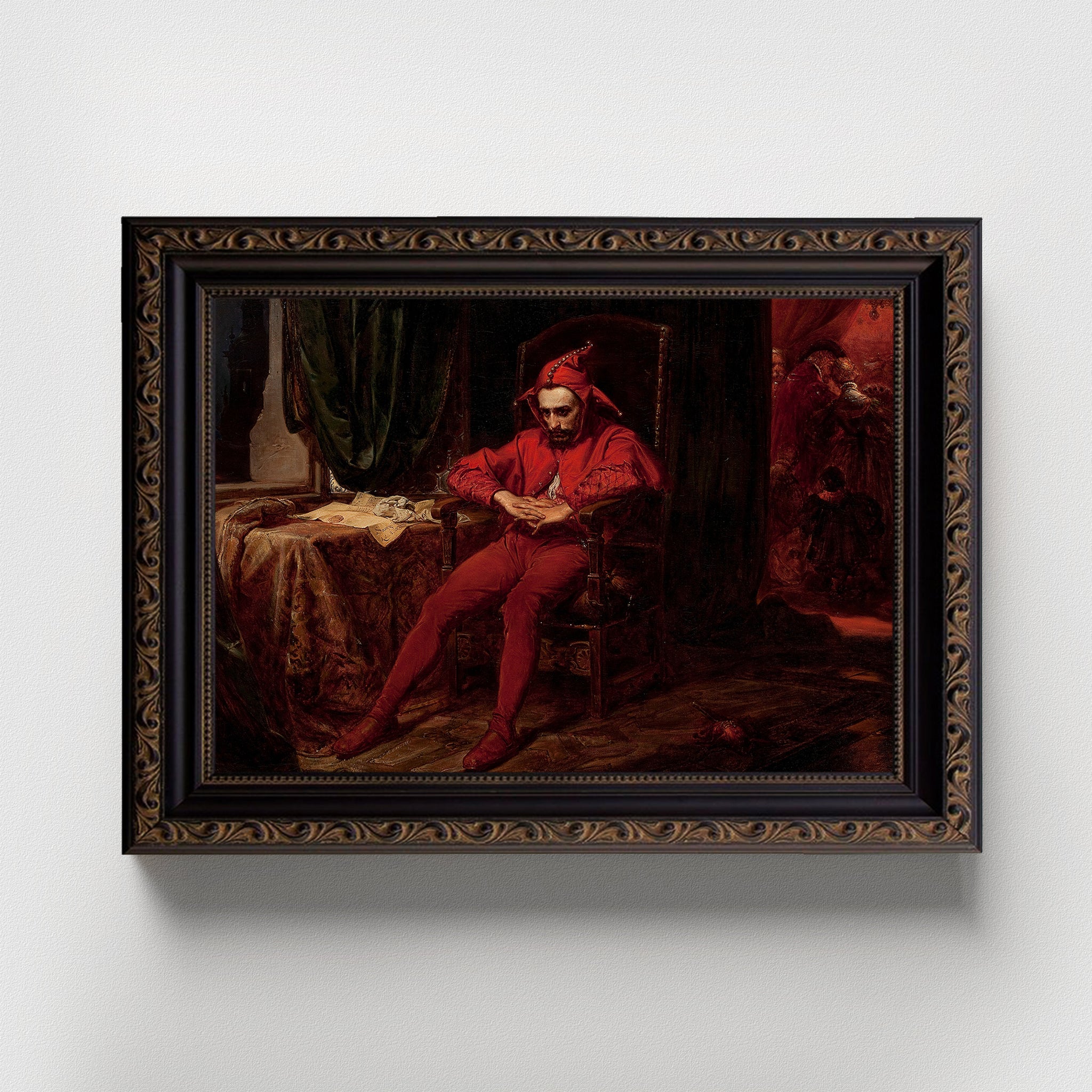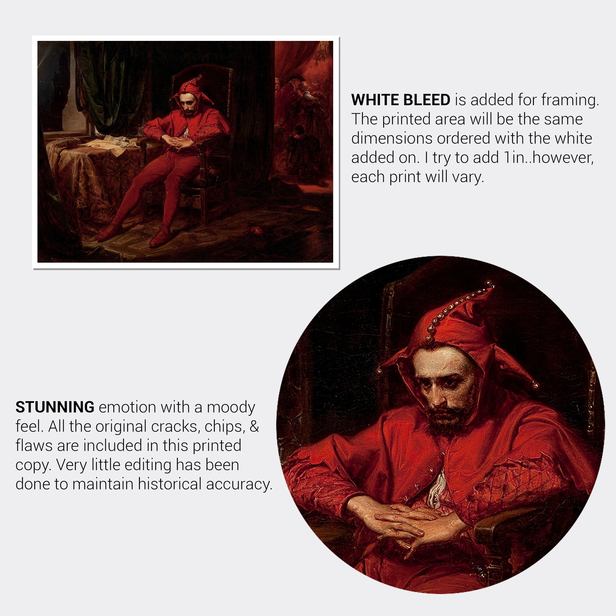 A high-quality wall art print on Matte Archival Paper. This is a moody portrait of the famous Court Jester Stańczyk. His solemn face contrasts the Queen's ball in the background. The emotion of loss during times of war and politics still holds today. The colors are brown, red, and black. You will receive one (1) unframed print in your choice of size. This will be printed to order in 3-5 working days.