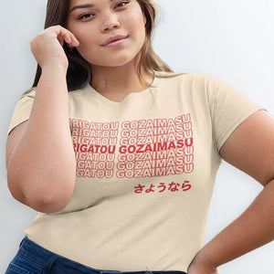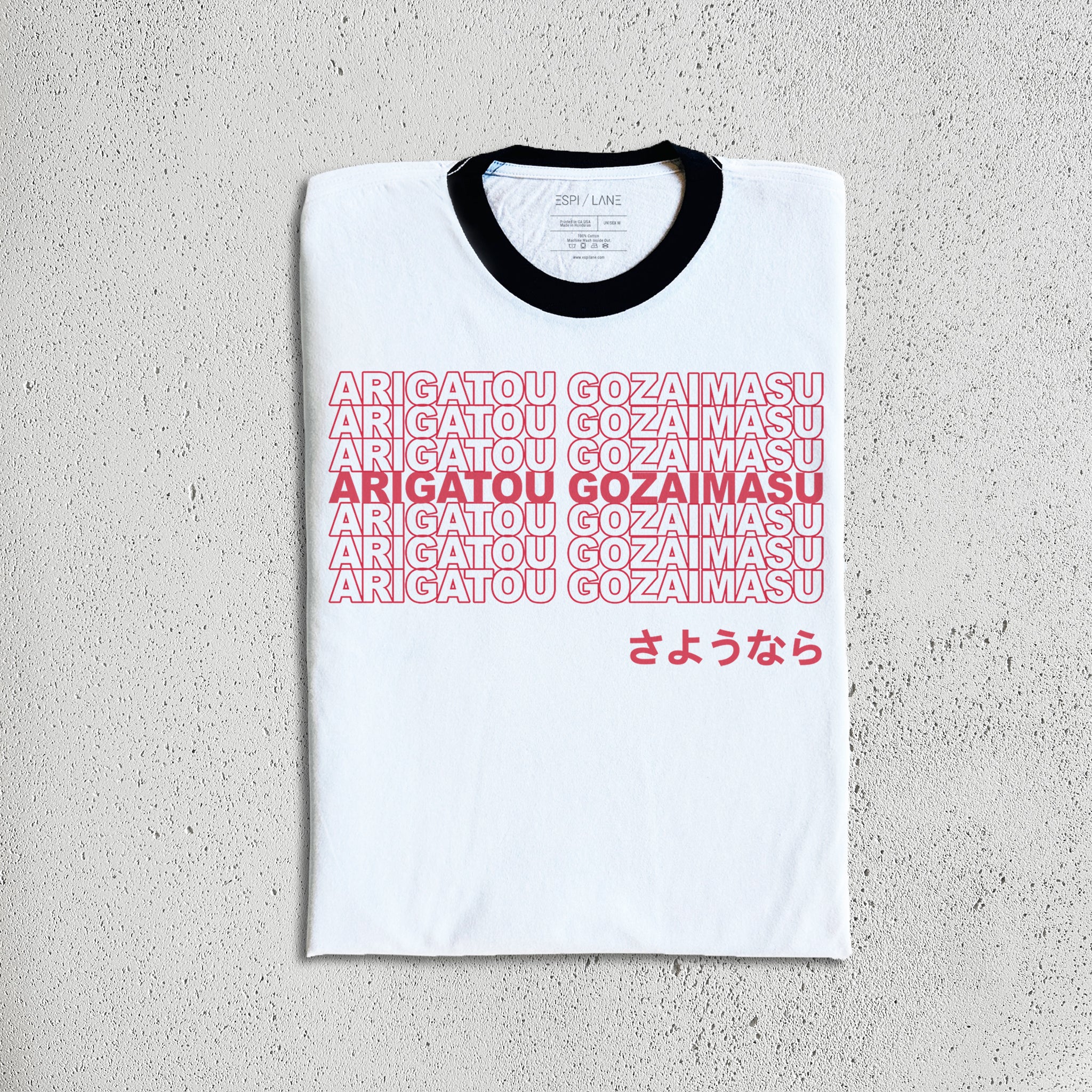 Arigatou Gozaimasu Thank You Sayonara Shirt. Drawn and designed by Espi Lane (me), and printed on a 100% cotton tee. You can choose between a ringer and standard crew in unisex or close fit. The graphic is printed using eco-friendly water-based ink.