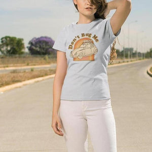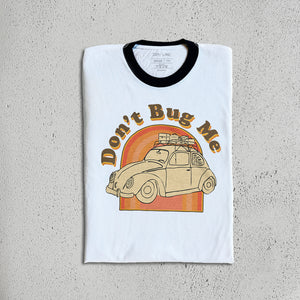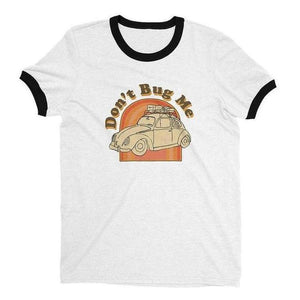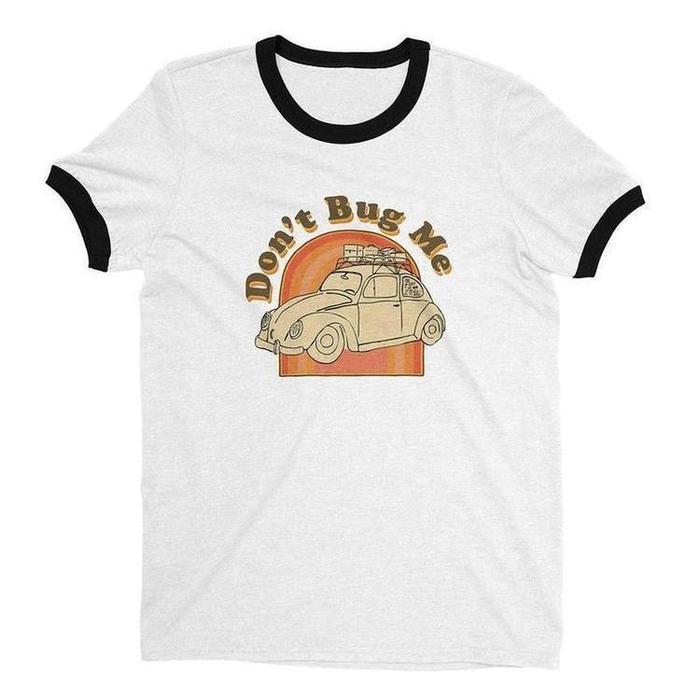 Vintage Inspired Don't Bug Me Shirt. This is a funny car pun shirt I made years ago thinking of an ex. It's printed using eco-friendly water-based ink. You can choose between a ringer and standard crew in a unisex or slim-fit. Most shirts are made of 100% premium ringspun cotton. The pink ringer is 50/50 cotton poly.