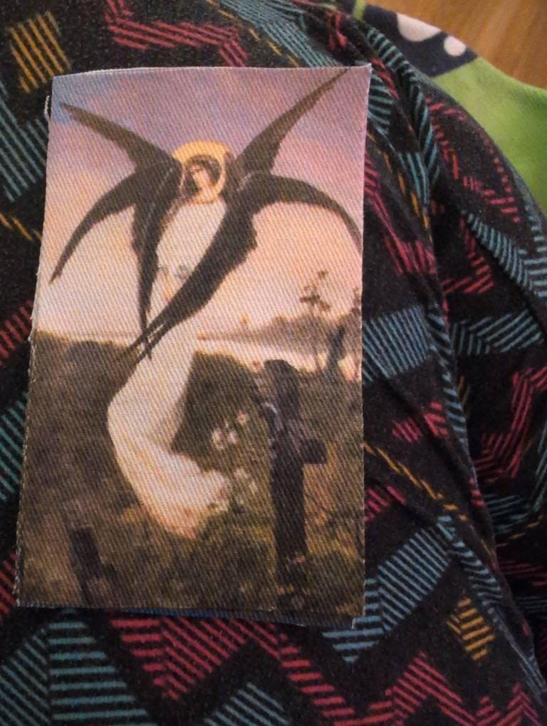 This is a DIY printed patch for your jacket, vest, shirt, backpack, or bag. It features "The Angel of Sorrow" aka "The Angel in a Cemetery," a painting by Wilhelm Kotarbiński, c. 1900. She has black wings and is in a beautiful graveyard scene.