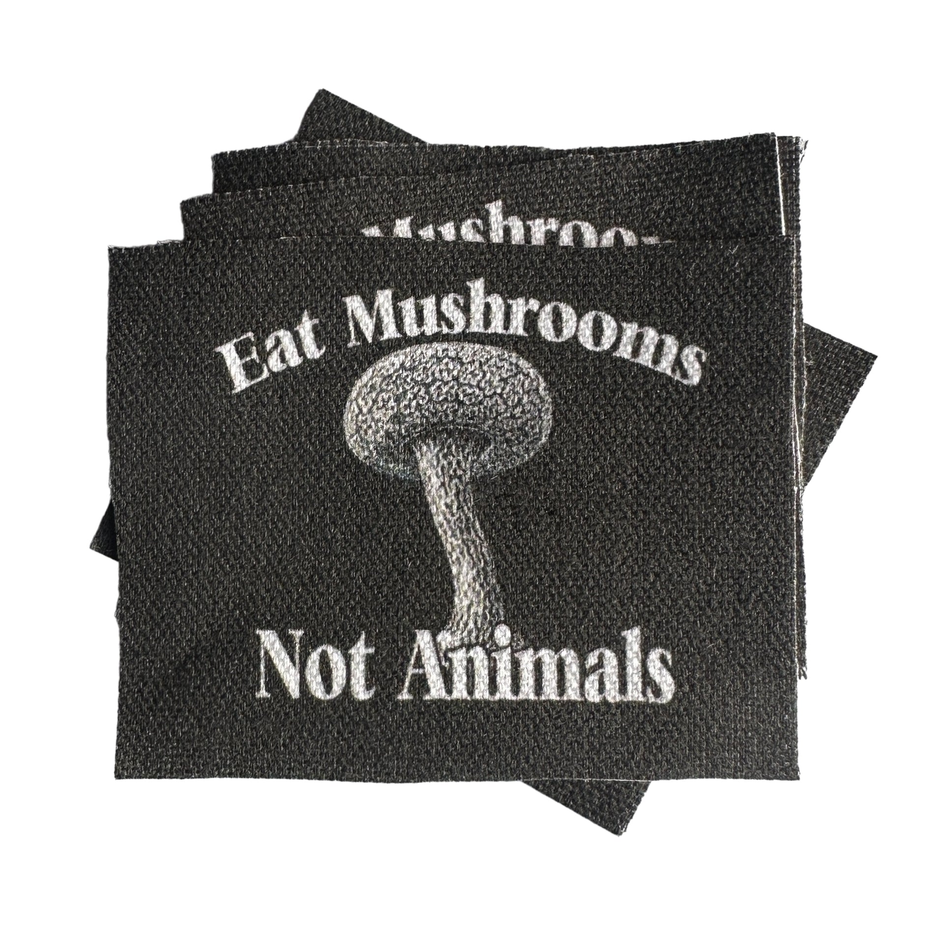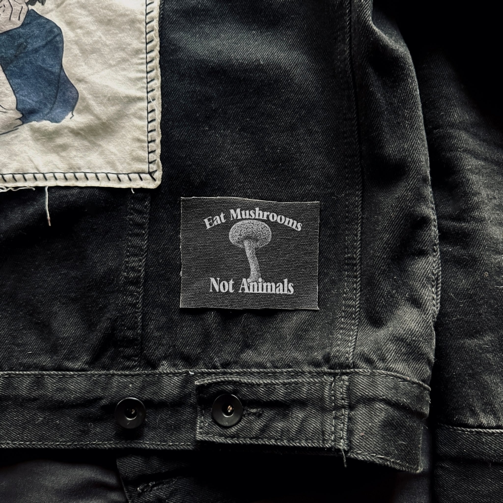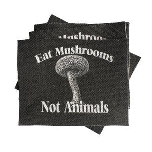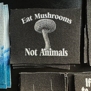 A handmade and printed patch for your jacket, vest, shirt, backpack, or bag. It will come sqaure-ish in shape. It reads: Eat Mushrooms Not Animals.