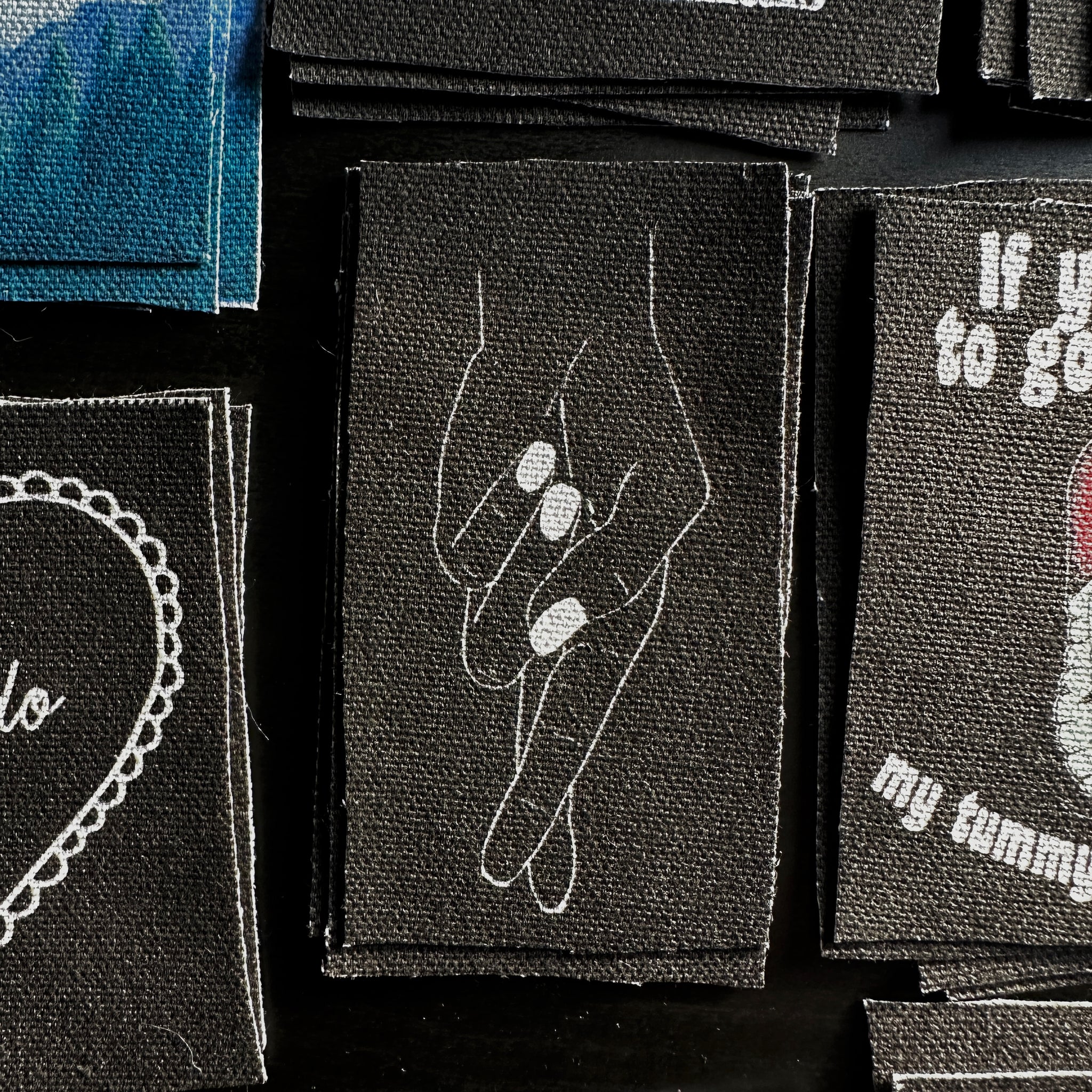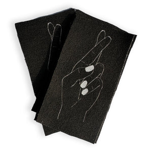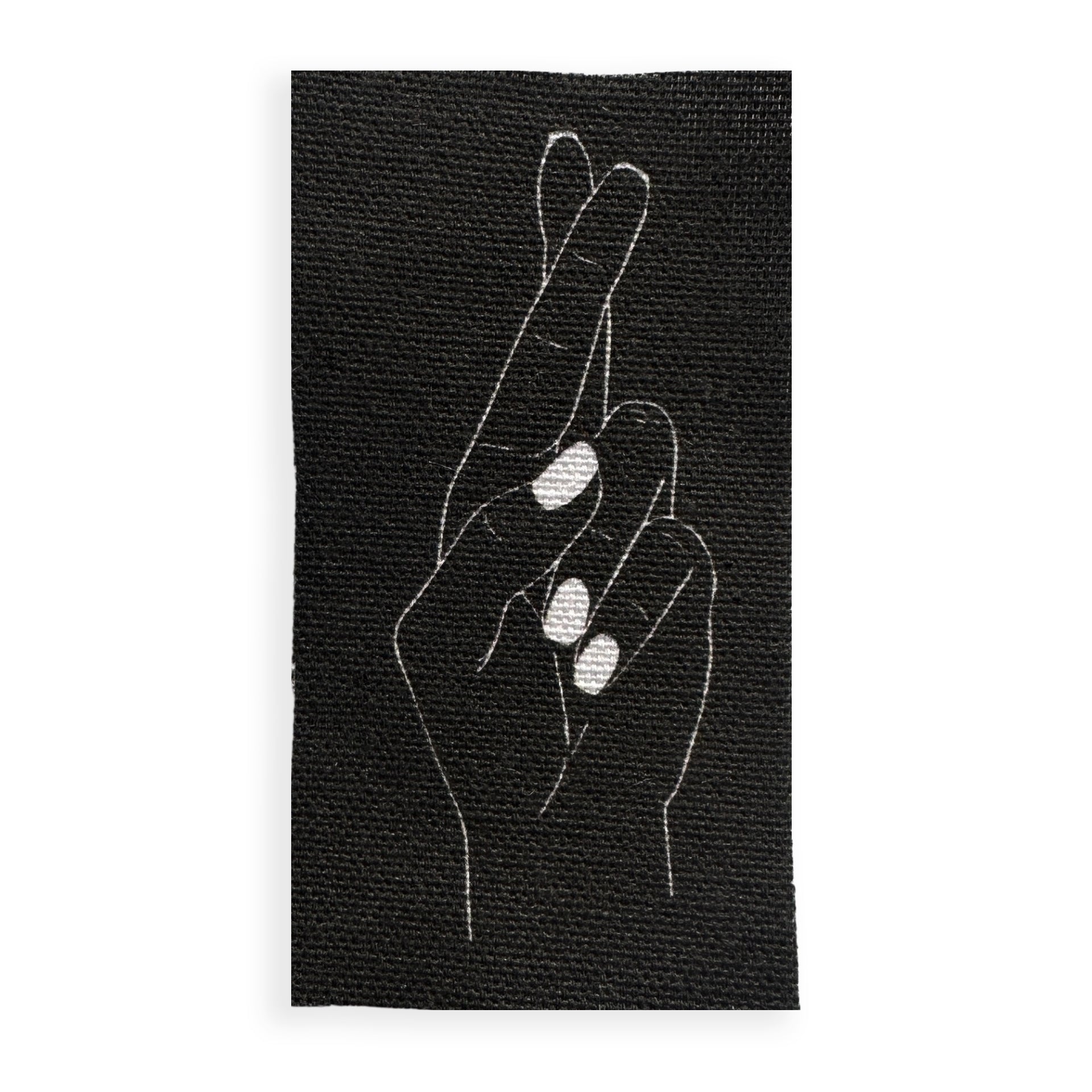 A DIY Feminist punk patch for your jacket, vest, shirt, backpack, or bag. It features: a hand drawn picture of a girl's hand with her fingers crossed. It's a perfect patch whether you break promises or need a little good luck.