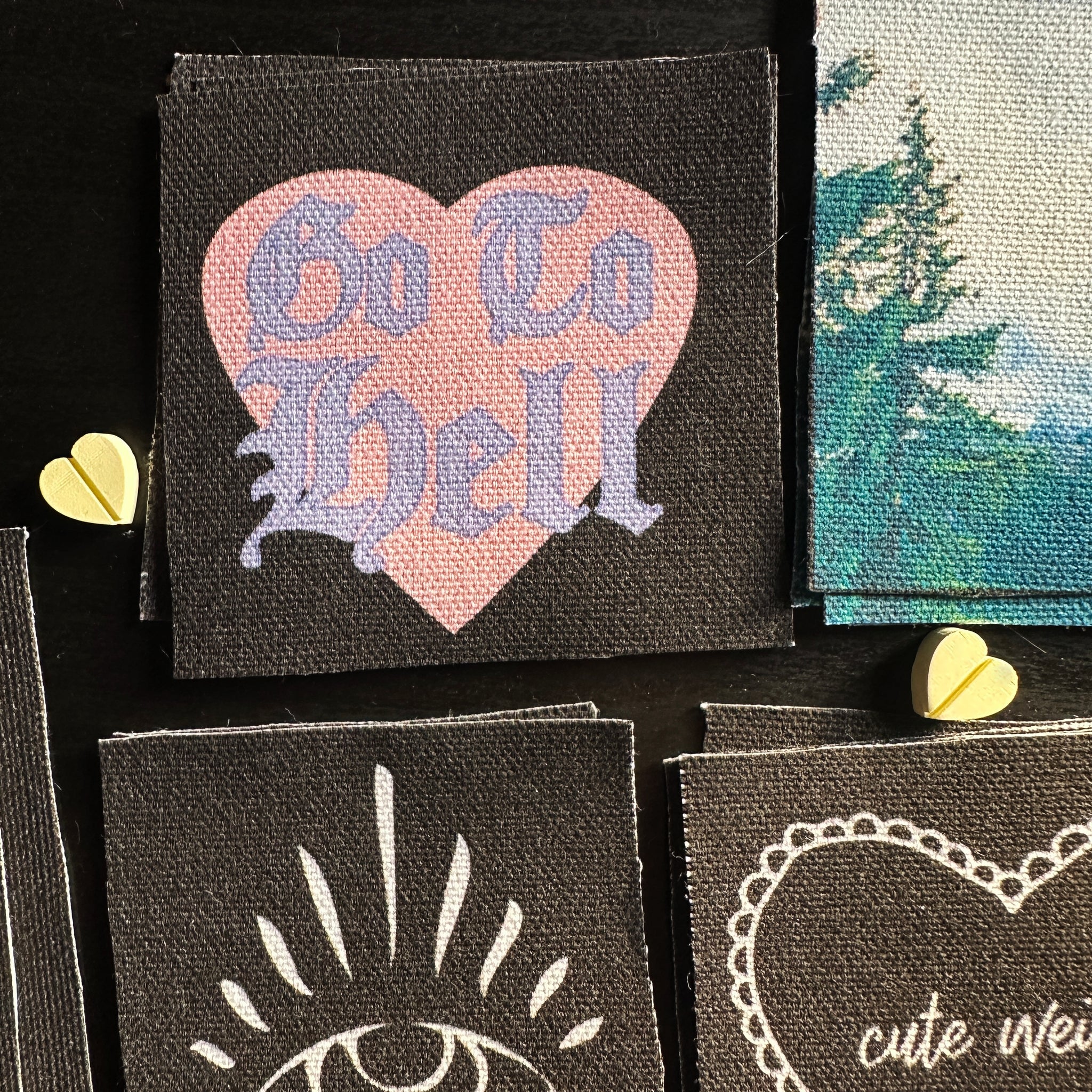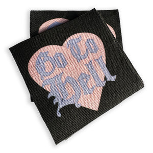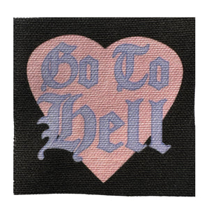 A DIY patch for your jacket, vest, shirt, backpack, or bag. It will be cut square-ish, and reads: "Go To Hell" in lavender Old English Font on a pink heart.