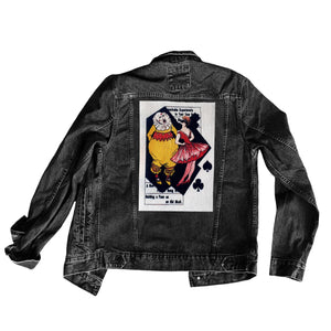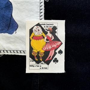 A large Jester patch for your jacket, vest, shirt, backpack, or bag. It will measure approximately 9.75x13". I use white sturdy canvas cotton. This item is hand-cut so size can vary slightly. Perfect for clown and circus lovers! It features an old advertisement with a clown and a woman. Some of the text reads: Remarkable experiments, and Building a face on an old skull.