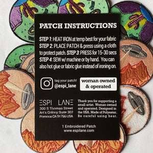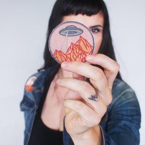 My UFO Mountain patch was designed by me for my line of patches and tees. Made with high-quality thread and backing that sticks perfectly to most garments, jacket shirts, bags, or hats. Comes mounted on a backer card with instructions.