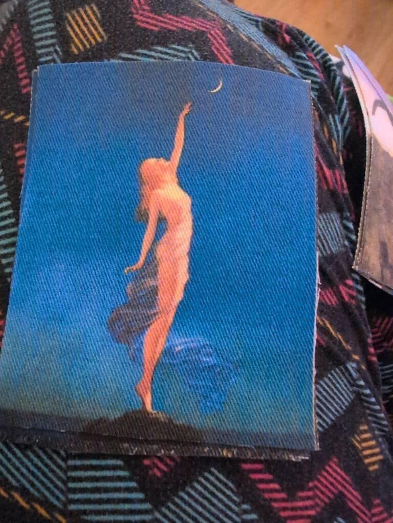 One (1) patch for your jacket, vest, shirt, backpack, or bag. It features a woman reaching for the moon on a rich dark blue background. Her skin is glowing in the moonlight. The art is by Edward Mason Eggleston from the 1930s.