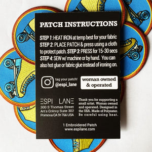 This is an eye-catching Quad Skate Iron On Embroidered Patch. Crafted with high-quality thread, this vibrant 3-inch patch showcases an original skate design drawn by EspiLane. Its sturdy iron-on backing ensures easy application on jackets, backpacks, hats, totes, and more. Each patch comes shipped on a backer card with straightforward instructions, making it easy to personalize your belongings. Express your love for skating or add a touch of retro flair with this captivating embroidered accessory.