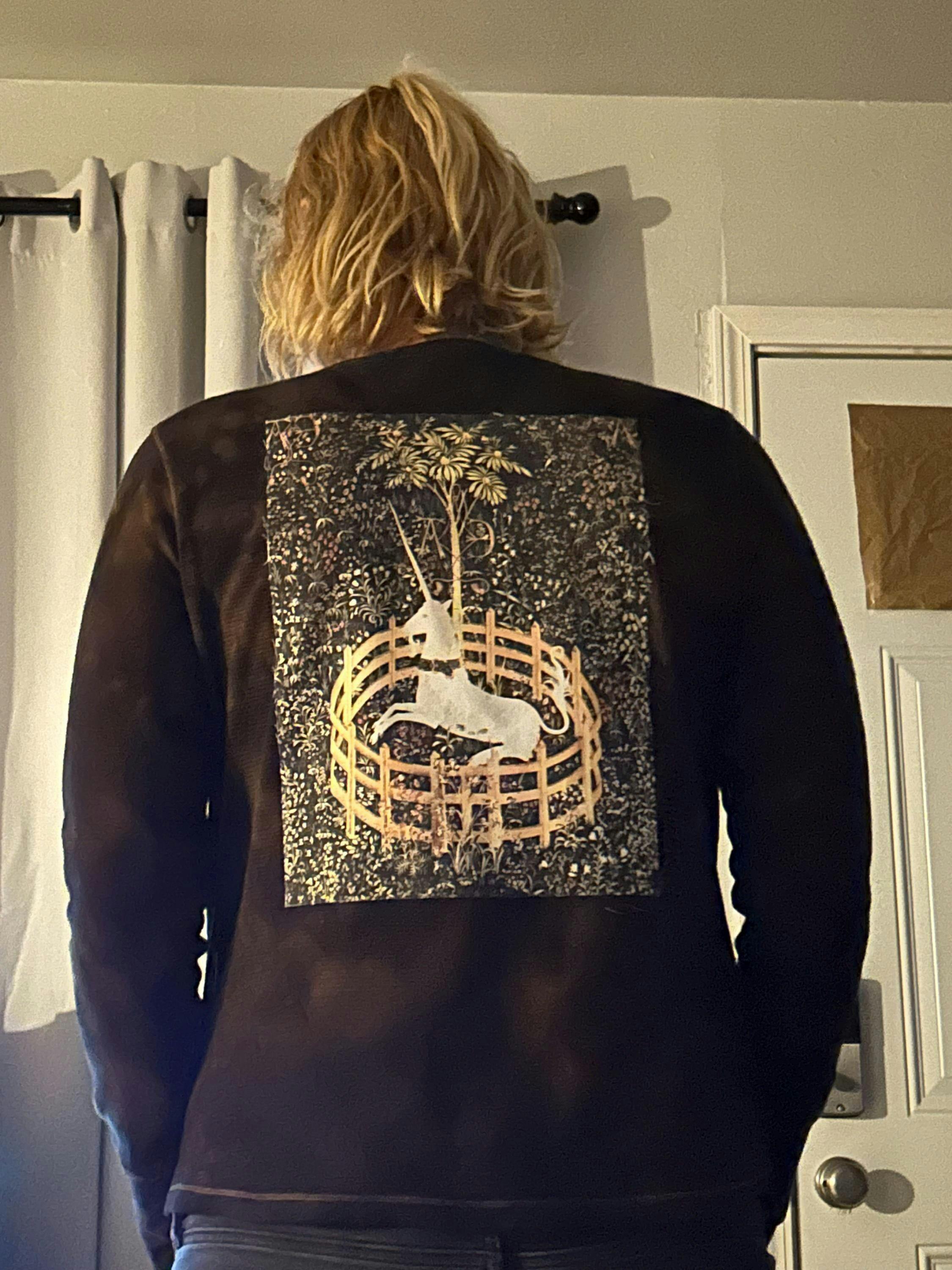 Make a bold and enchanted statement with this Unicorn in Captivity fabric patch, featuring the iconic 15th-century medieval tapestry. Measuring 10x13 inches, this large sew-on patch brings fantasy, symbolism, and timeless art to the back of your jacket, vest, or shirt.