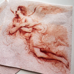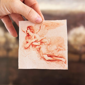 Add angelic detail to your wardrobe or craft project with this beautiful Angel fabric patch, featuring late 1630s art by Giovanni Francesco Barbieri (aka Guercino) done in red chalk on paper. Measuring 3.5x3.5", this DIY sew-on patch is perfect for adding classical art charm to jackets, bags, vests, and more.