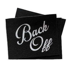 A DIY Feminist punk patch for your jacket, vest, shirt, backpack, or bag. It reads: BACK OFF.