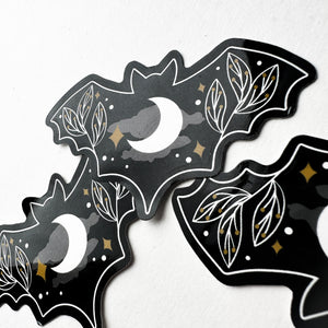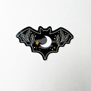 This vinyl sticker is made using original art by me. The design features a bat shape with moon and botanical elements. It's printed on strong waterproof material with a glossy finish. Works great to stick on laptops, tumblers, or stationary. Ships on a backer card to keep it safe.