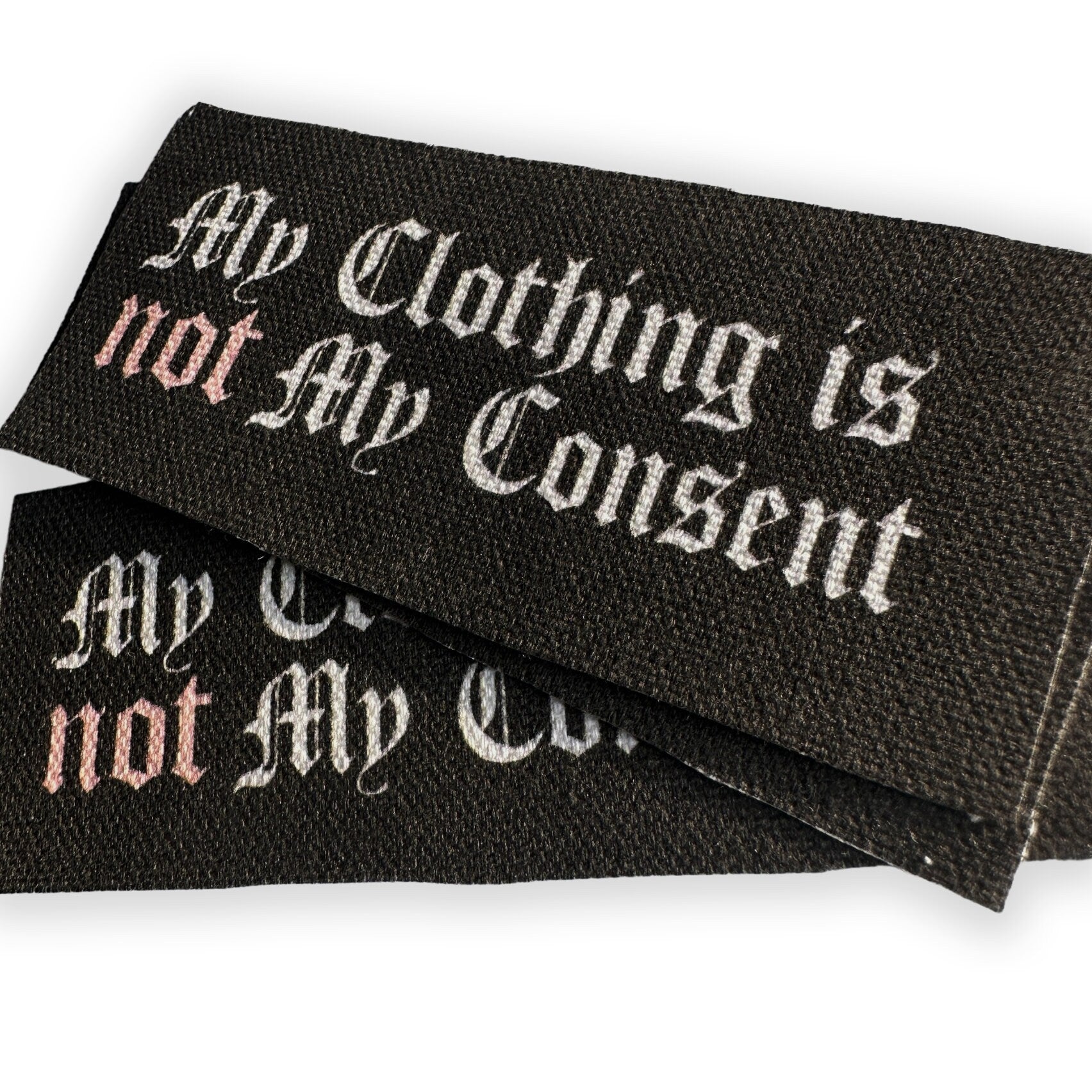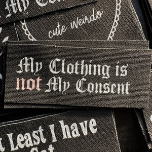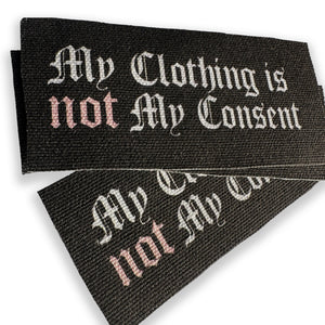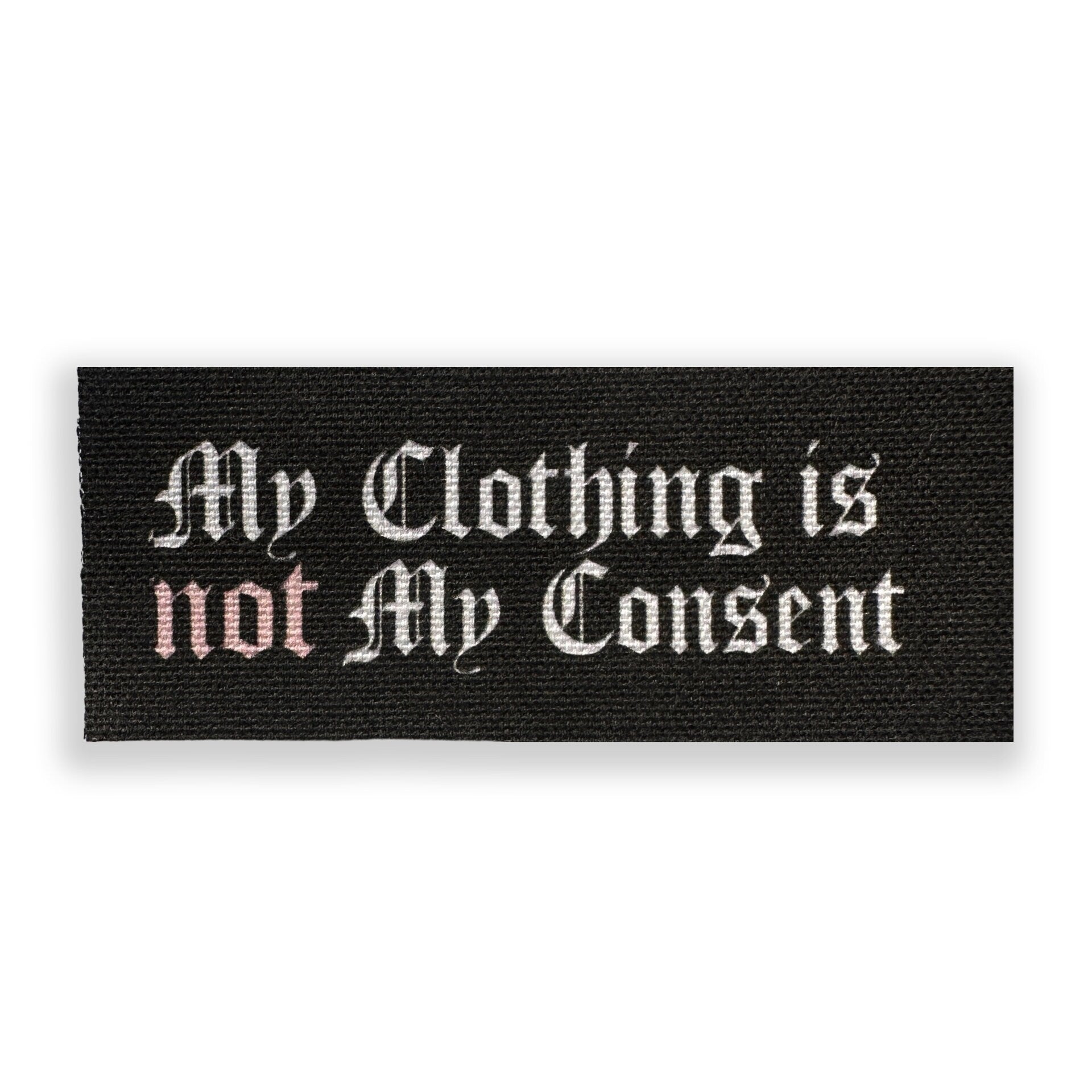 A DIY Feminist punk patch for your jacket, vest, shirt, backpack, or bag. It will be cut rectangular. It reads: My Clothing is not My Consent in white and pink Old English Font.