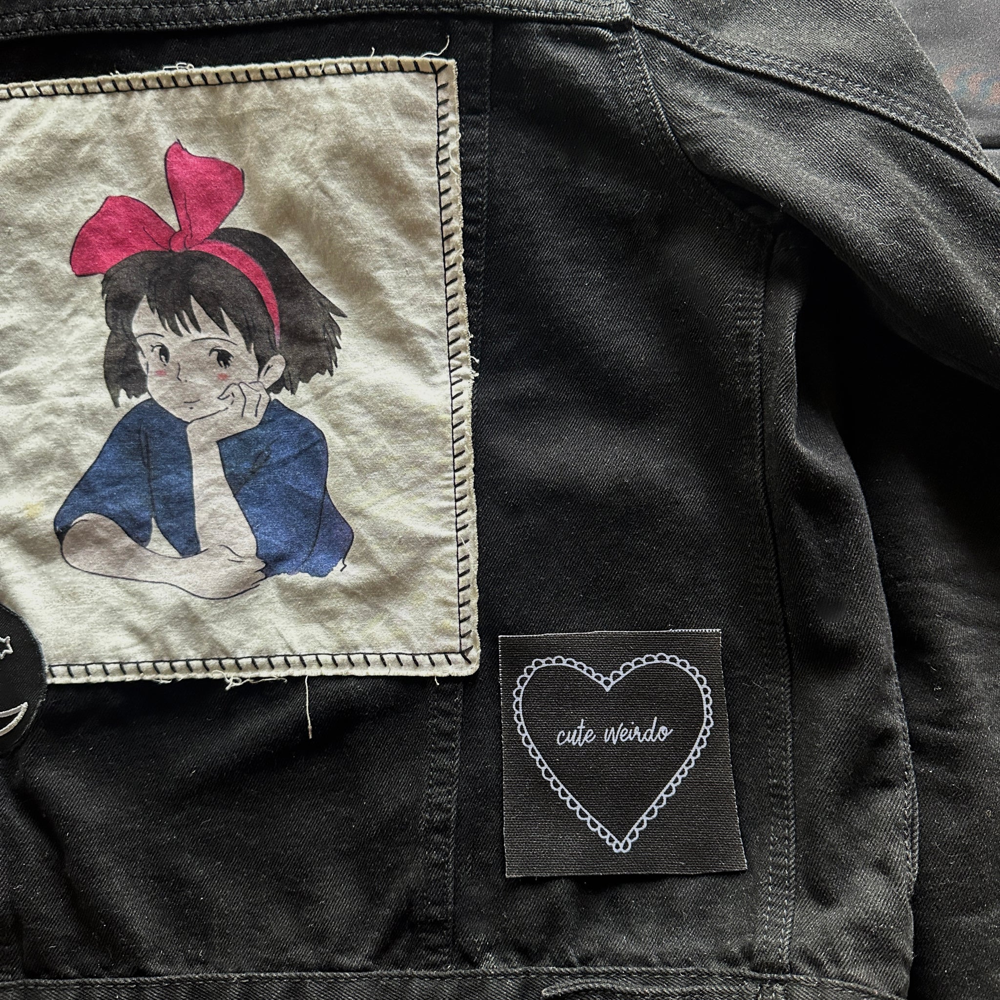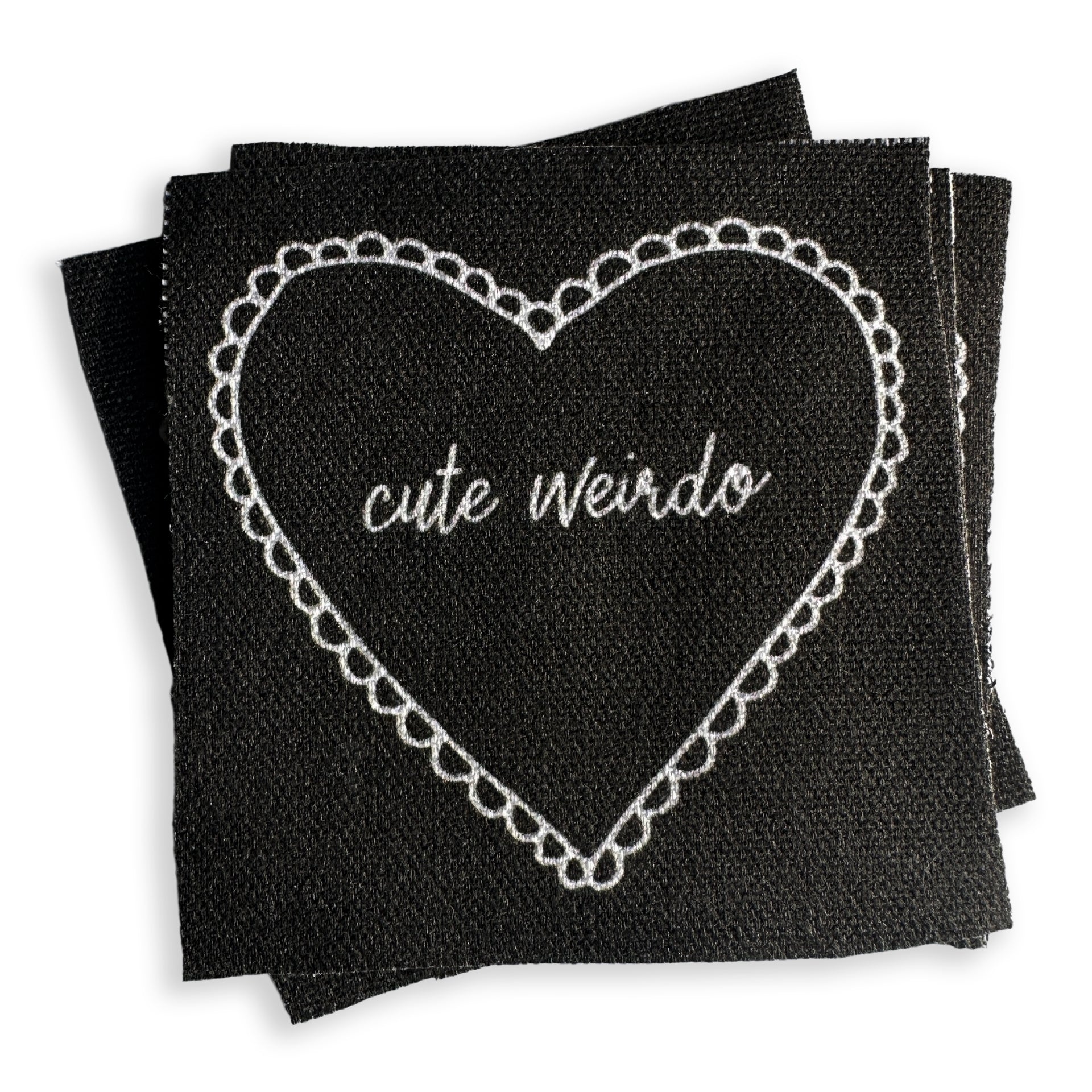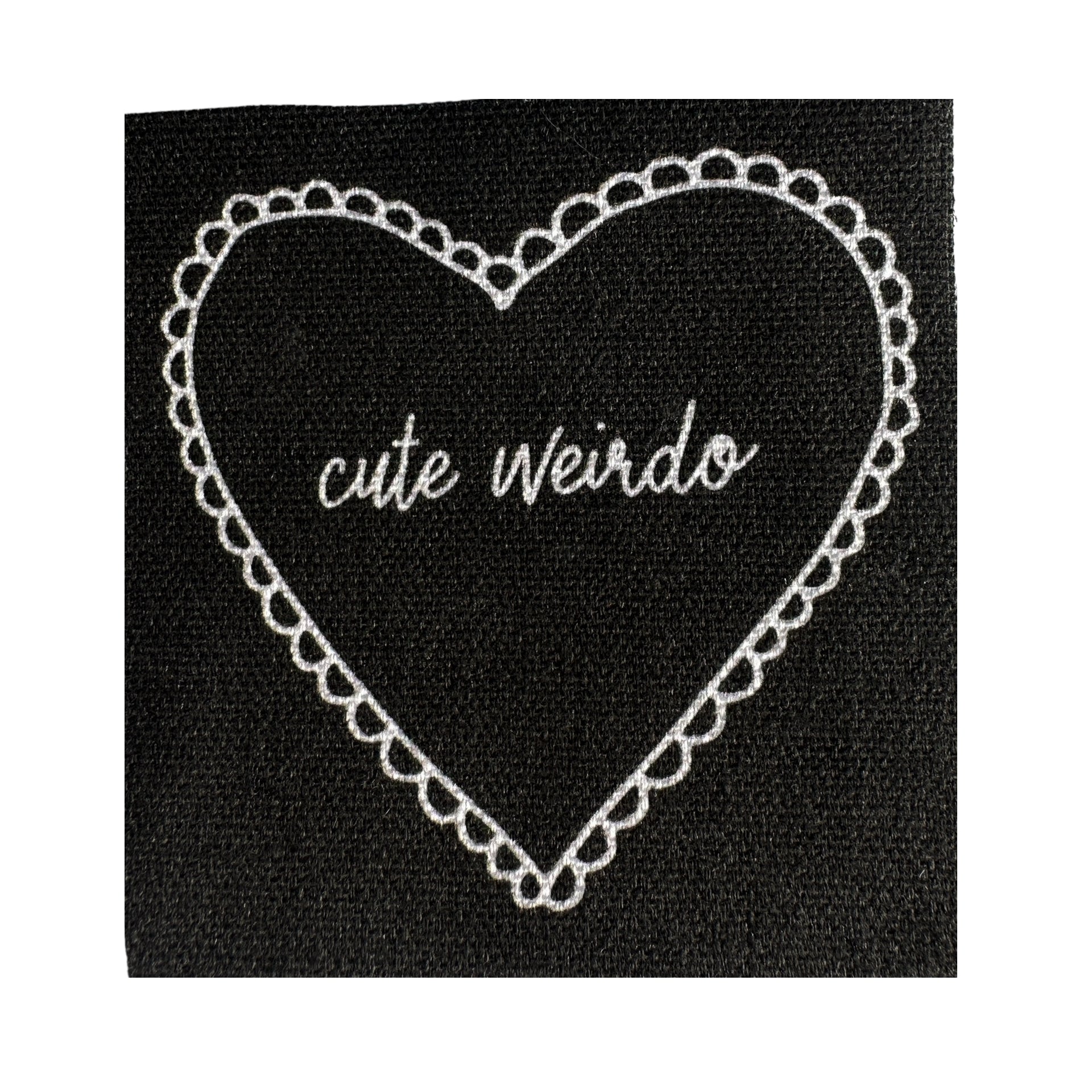 A DIY patch for your jacket, vest, shirt, backpack, or bag. It features a Valentine's Style Heart with "cute weirdo" written inside.