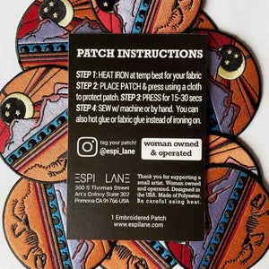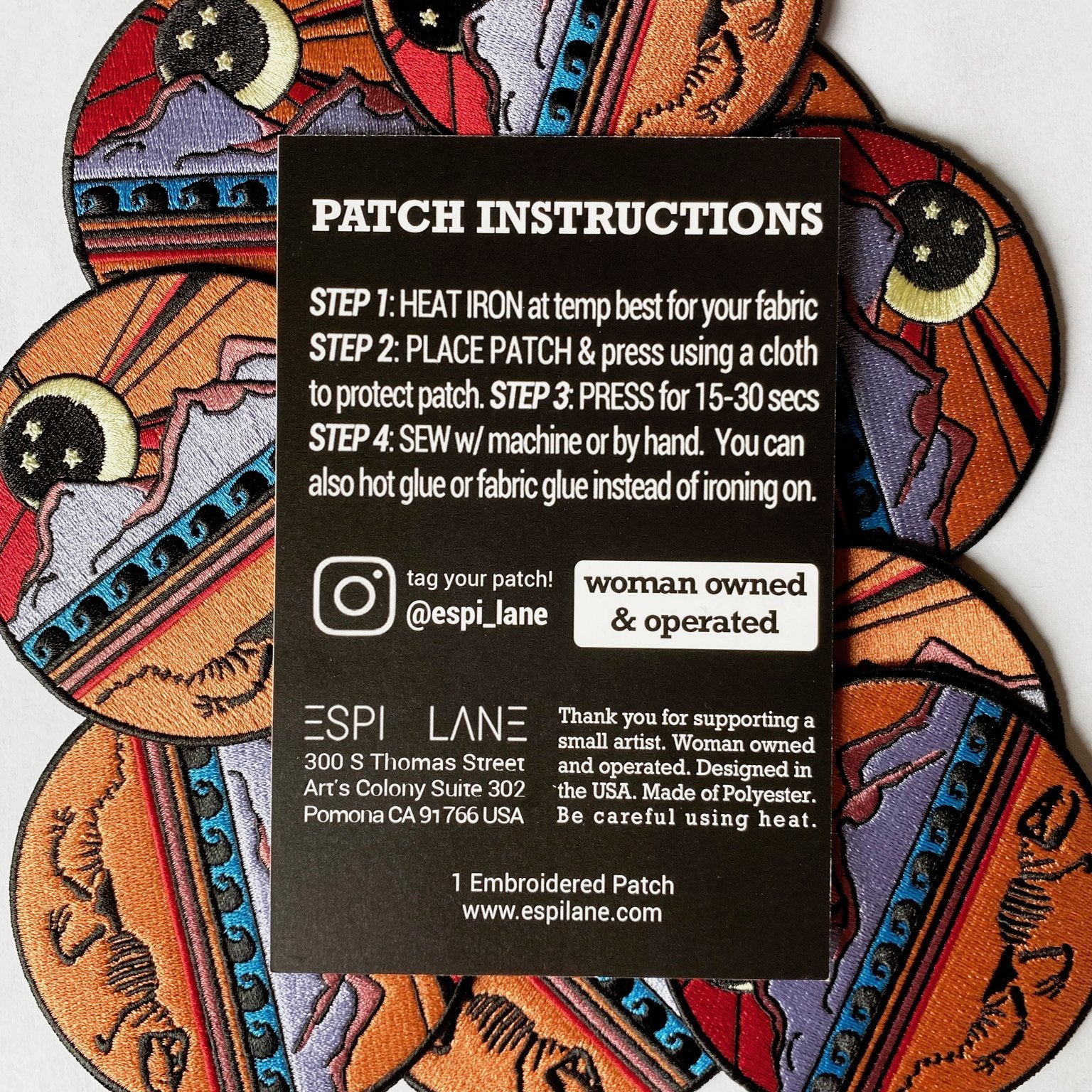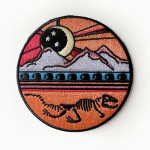 Retro Dinosaur Mountain Iron On Embroidered Patch that shows all the natural elements of our amazing planet. A dinosaur is waiting to be discovered under layers of the earth. The original drawing was created by EspiLane (me) and is 100% embroidered. This patch is easy to install on any jacket, backpack, hat, tote, and more. It comes shipped on a backer card with easy-to-follow instructions.