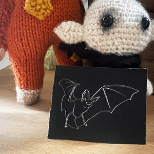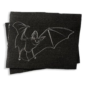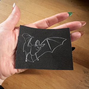 A Bat patch for your jacket, vest, shirt, backpack, or bag. It will come rectangular-ish in shape. It features my artwork based on my other drawings with the same concept. Sew it on however you want. Use a fray glue on the edges if you don't want any fraying.