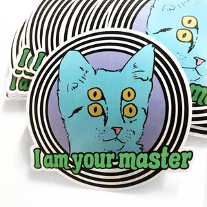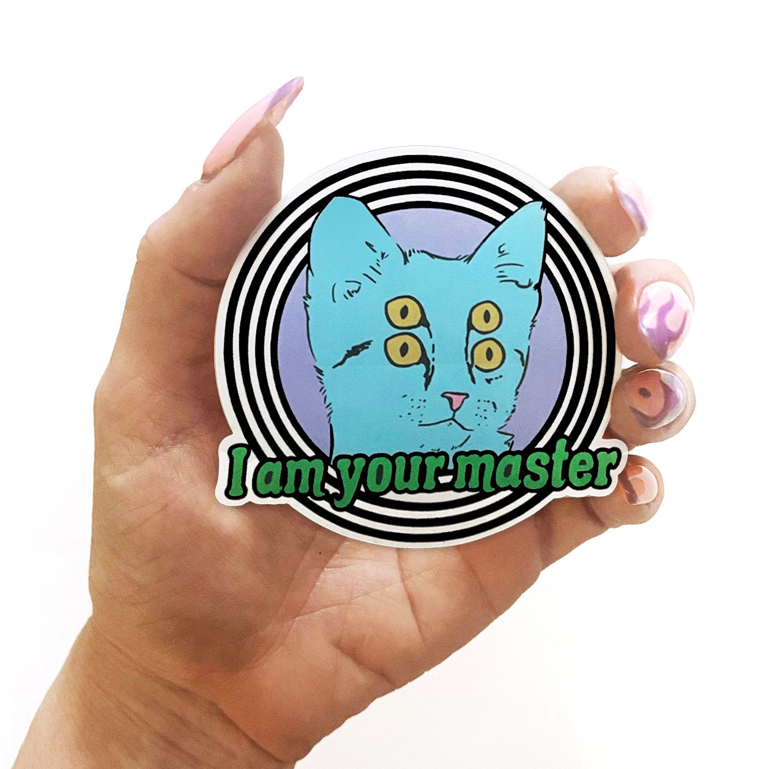 Hypnotic "I'm Your Master" Cat Decal with original art by me. It's printed on strong waterproof vinyl with a glossy finish. This sticker works great on any surface like laptops, tumblers, stationary, or windows. Ships on a backer card to keep it safe.