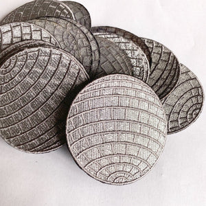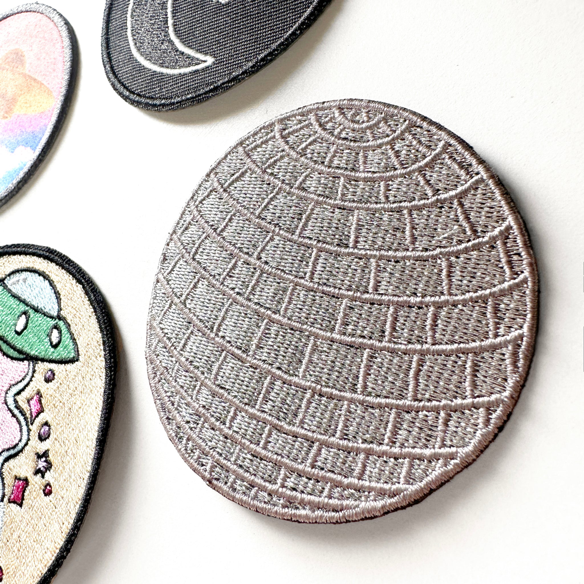 Disco Ball Iron On Embroidered Patch with Iron-On backing. This design was drawn by me and has high-quality metallic silver thread. Comes mounted on a backer card with installation instructions.