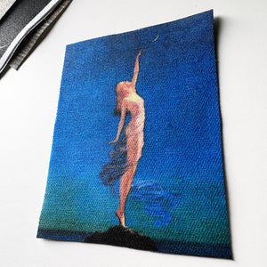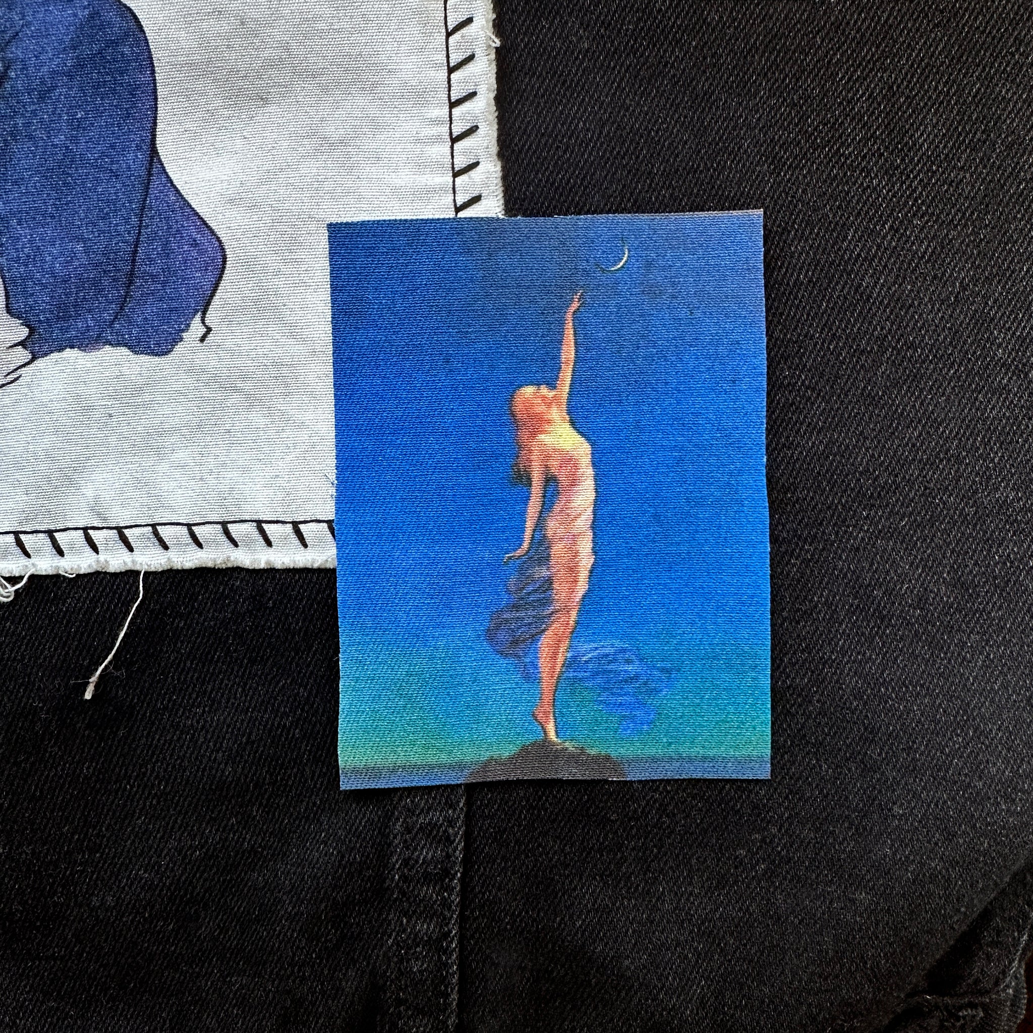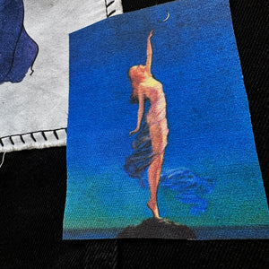 One (1) patch for your jacket, vest, shirt, backpack, or bag. It features a woman reaching for the moon on a rich dark blue background. Her skin is glowing in the moonlight. The art is by Edward Mason Eggleston from the 1930s.