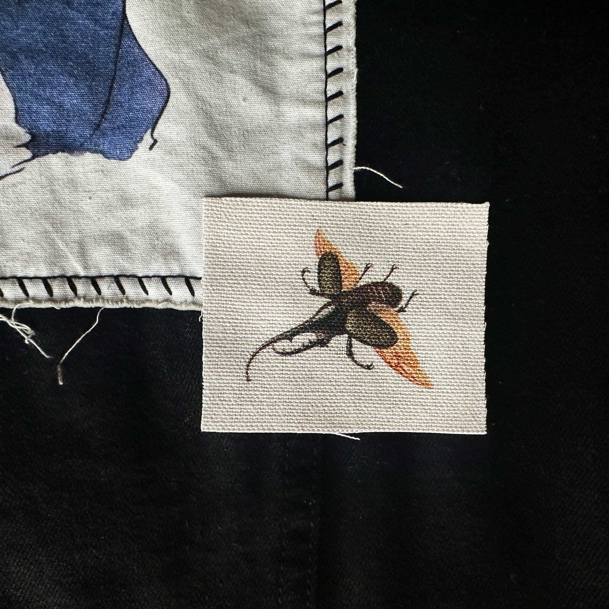 A diy printed patch for your jacket, vest, shirt, backpack, or bag. It will come square-ish in shape and measure approximately 3x2.25". It features a rhinoceros beetle in muted brown, yellow, and cream colors.
