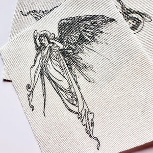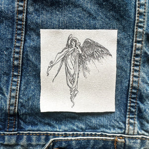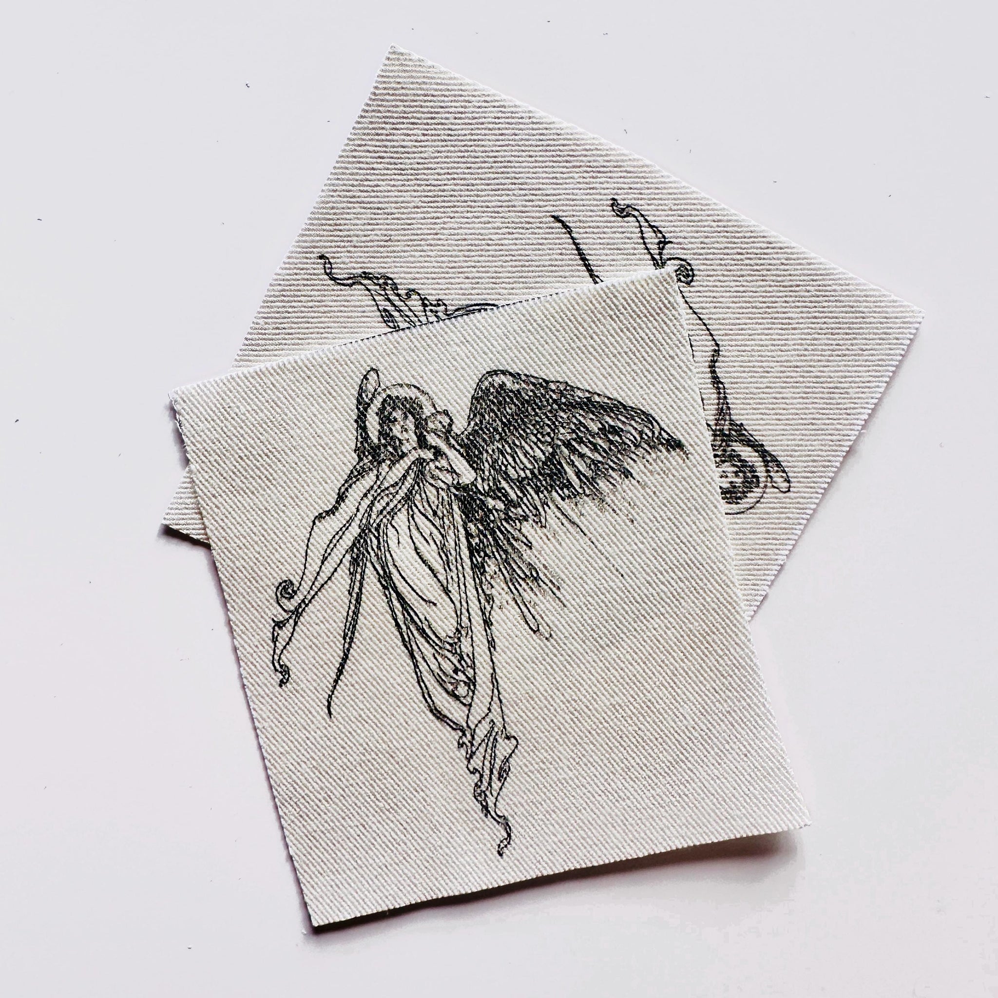 This is a raw fabric printed patch for your jacket, vest, shirt, backpack, or bag. It measures approximately 3.5x3.2". It features an 1899 Illustration by Charles Robinson from Hans Christian Andersen's Fairy Tales. It's titled, "An Angel Takes a Dead Child to the Places It Loved"