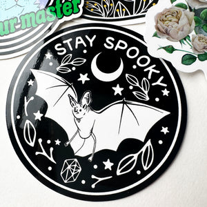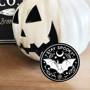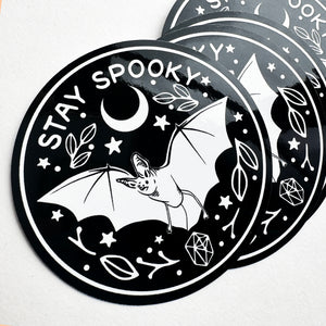 This Stay Spooky Vinyl Sticker is printed on strong waterproof vinyl with a glossy finish. This sticker works great on any surface like laptops, tumblers, stationary, or windows. Ships on a backer card to keep it safe.