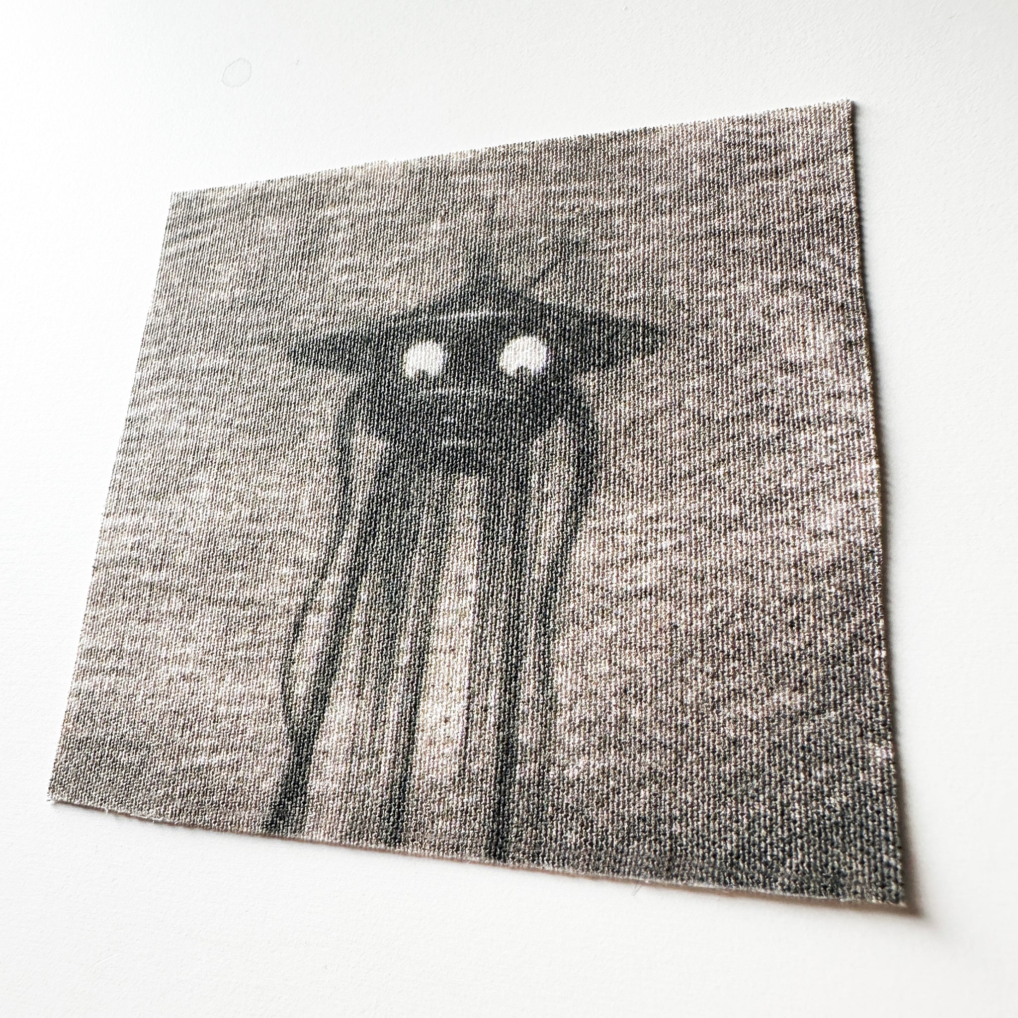 This is a DIY patch for your jacket, vest, shirt, backpack, or bag. Drawn in 1906 by Henrique Alvim Corrêa for HG Well's 1897 book, War of the Worlds. It features a "tripod" alien from the story. It appears to be a flying saucer with several legs and large white eyes.