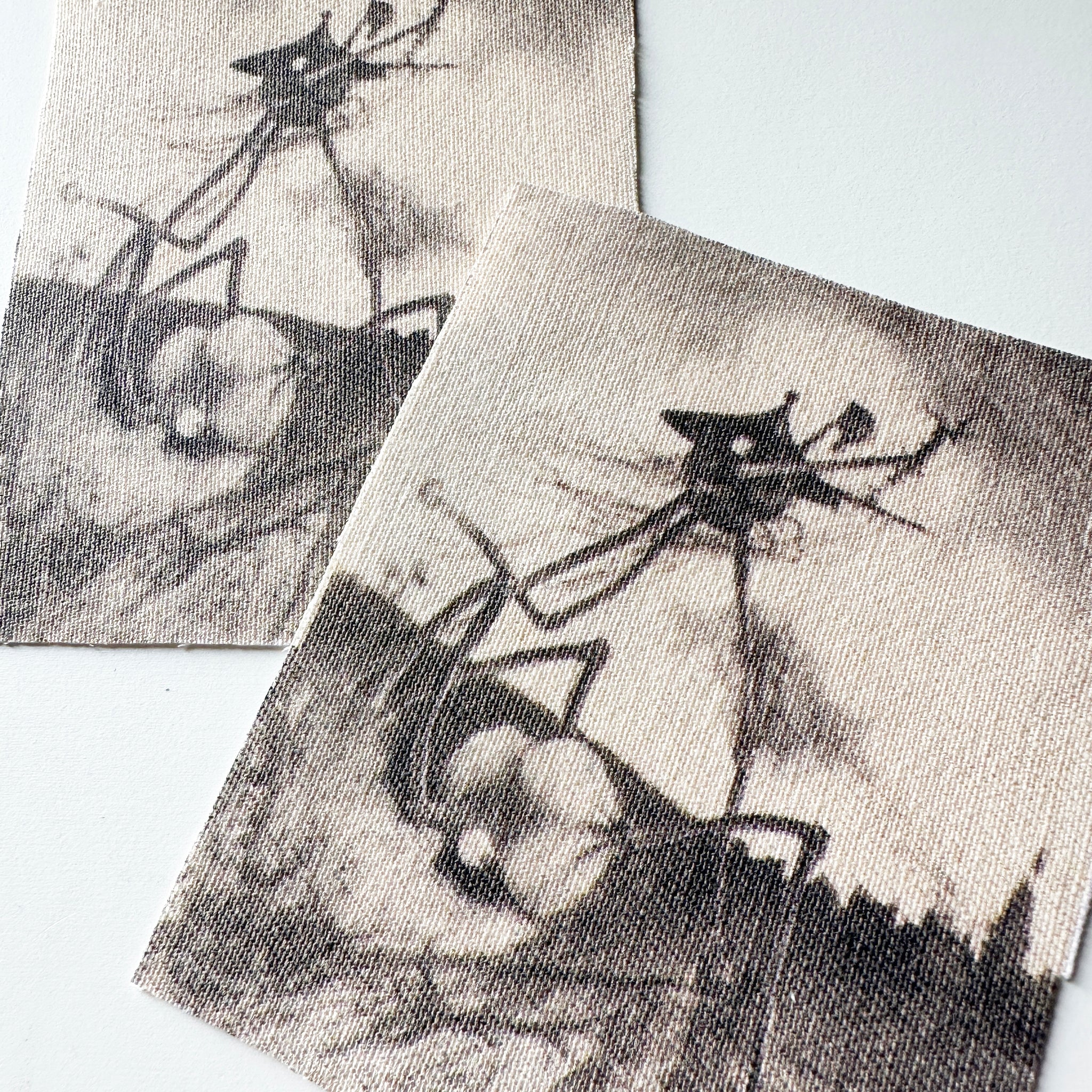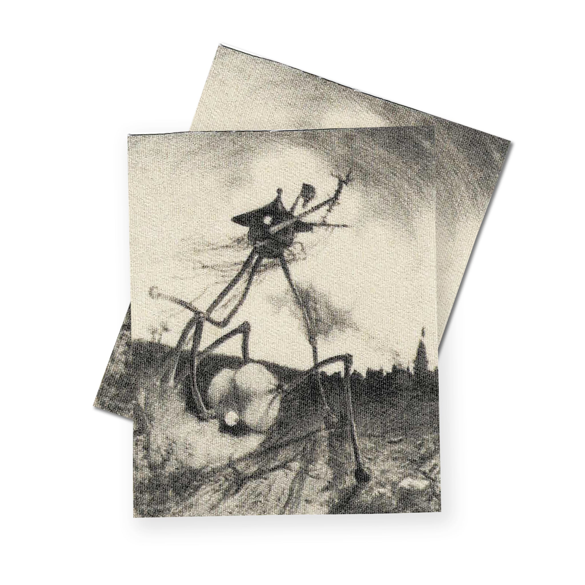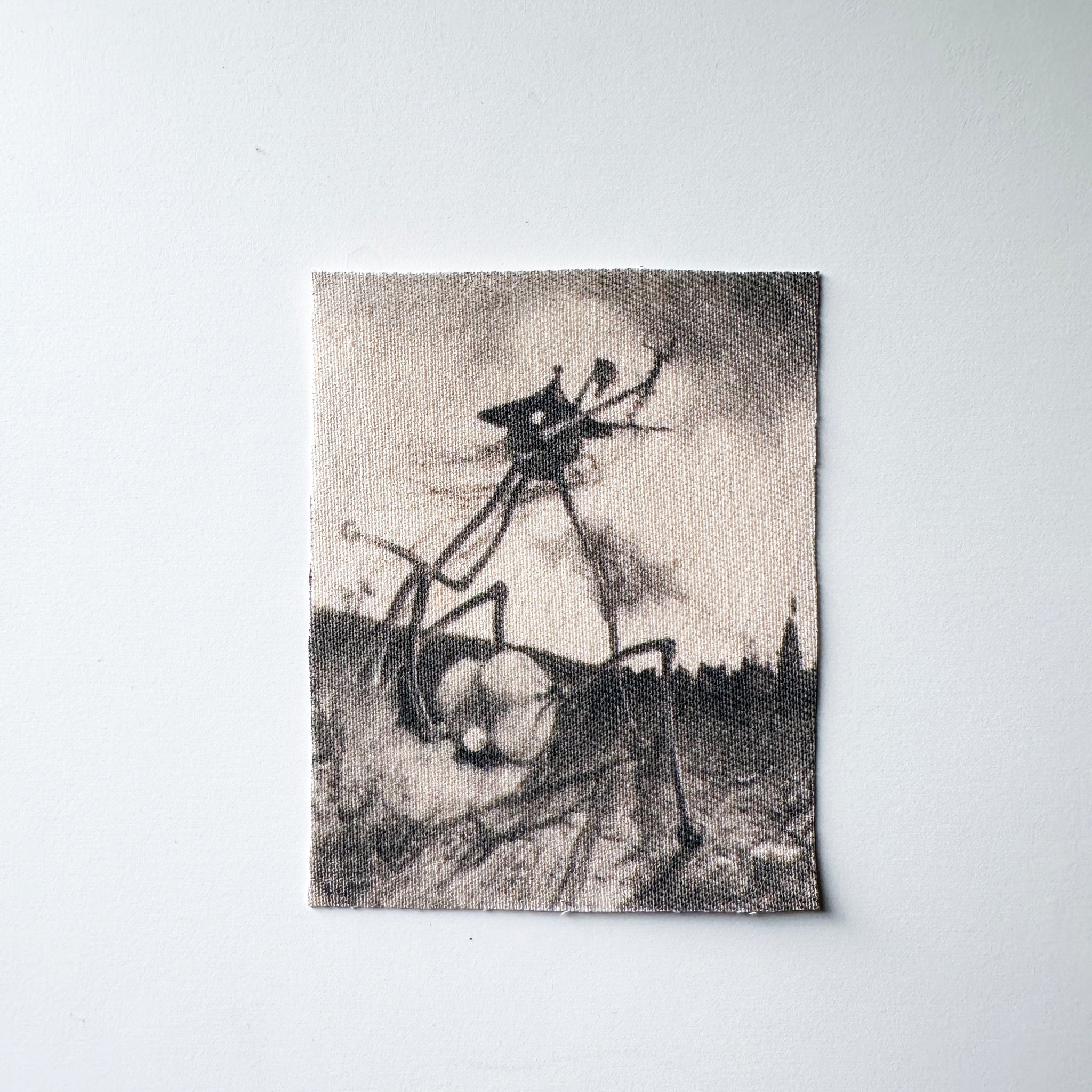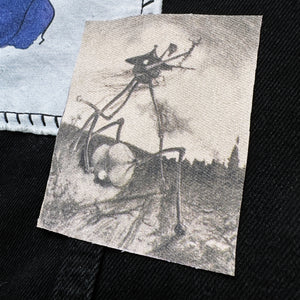 This is a DIY patch for your jacket, vest, shirt, backpack, or bag. Drawn in 1906 by Henrique Alvim Corrêa for HG Well's 1897 book, War of the Worlds. It features a man watching in fear as an octopus-amphibian alien emerges from a disk-shaped spaceship.