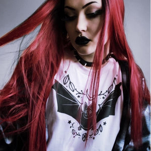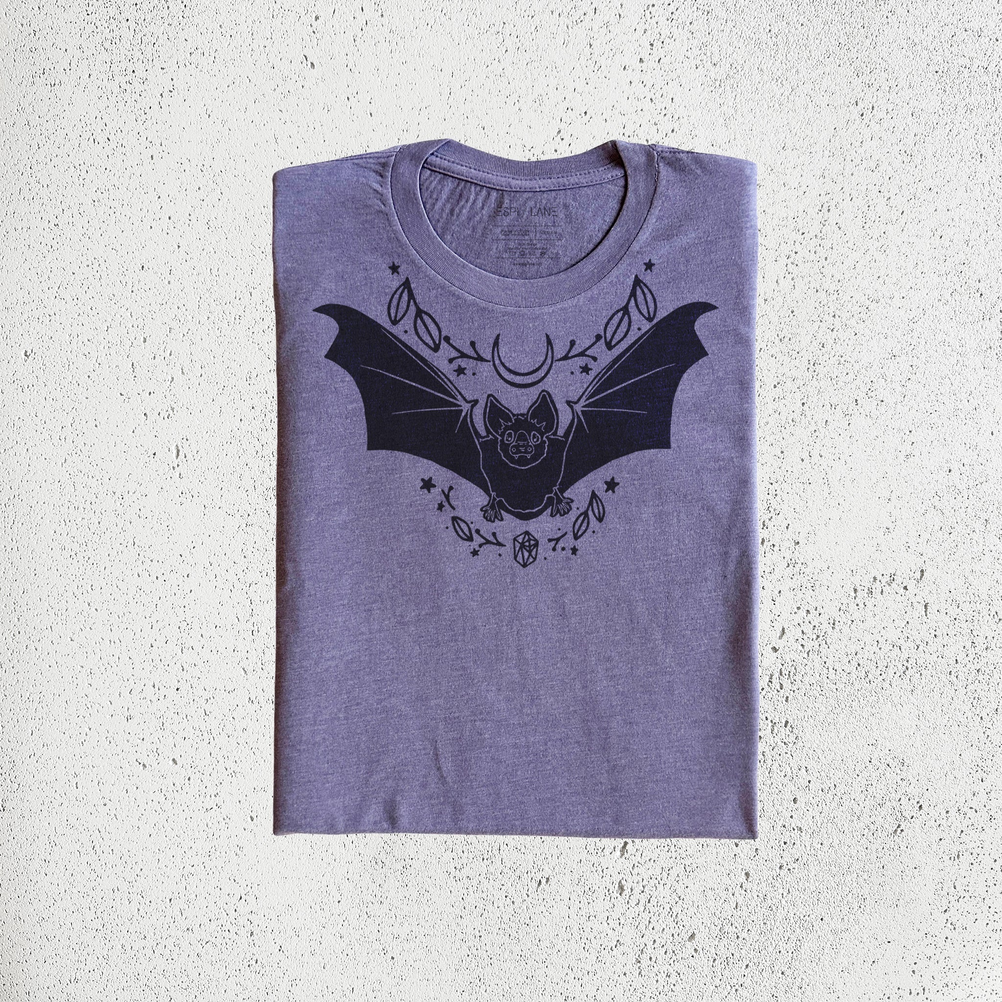 Bat Graphic Shirt drawn and designed by me for my love of bats and everything spooky. This is printed high on the chest using eco-friendly water-based ink. You can choose between a ringer and standard crew in unisex fit tee. Unisex t-shirts run big on her/them.