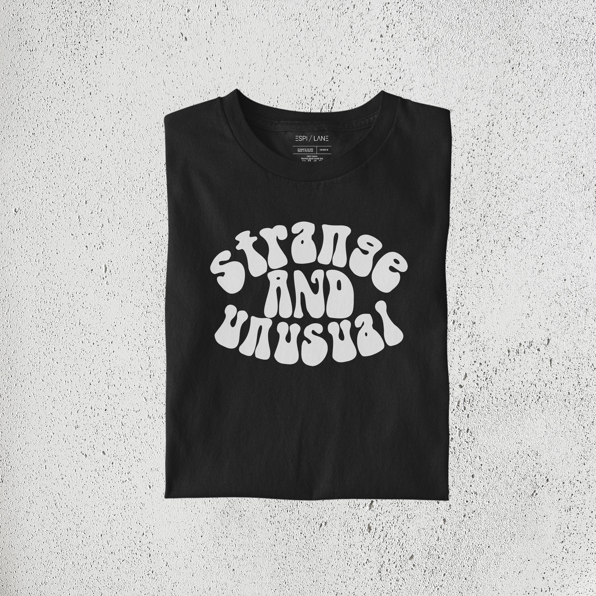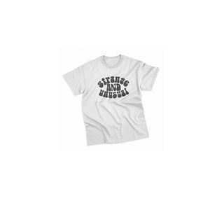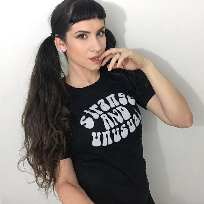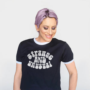 Strange & Unusual T-Shirt. A little gothic, a little retro... printed using eco-friendly water-based ink. You can choose between a ringer and standard crew in a unisex fit. All shirts are made of 100% premium ringspun cotton.