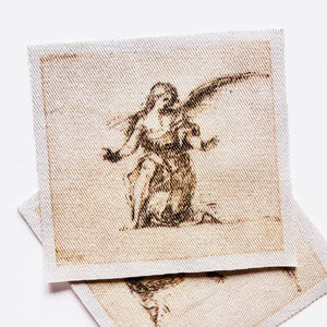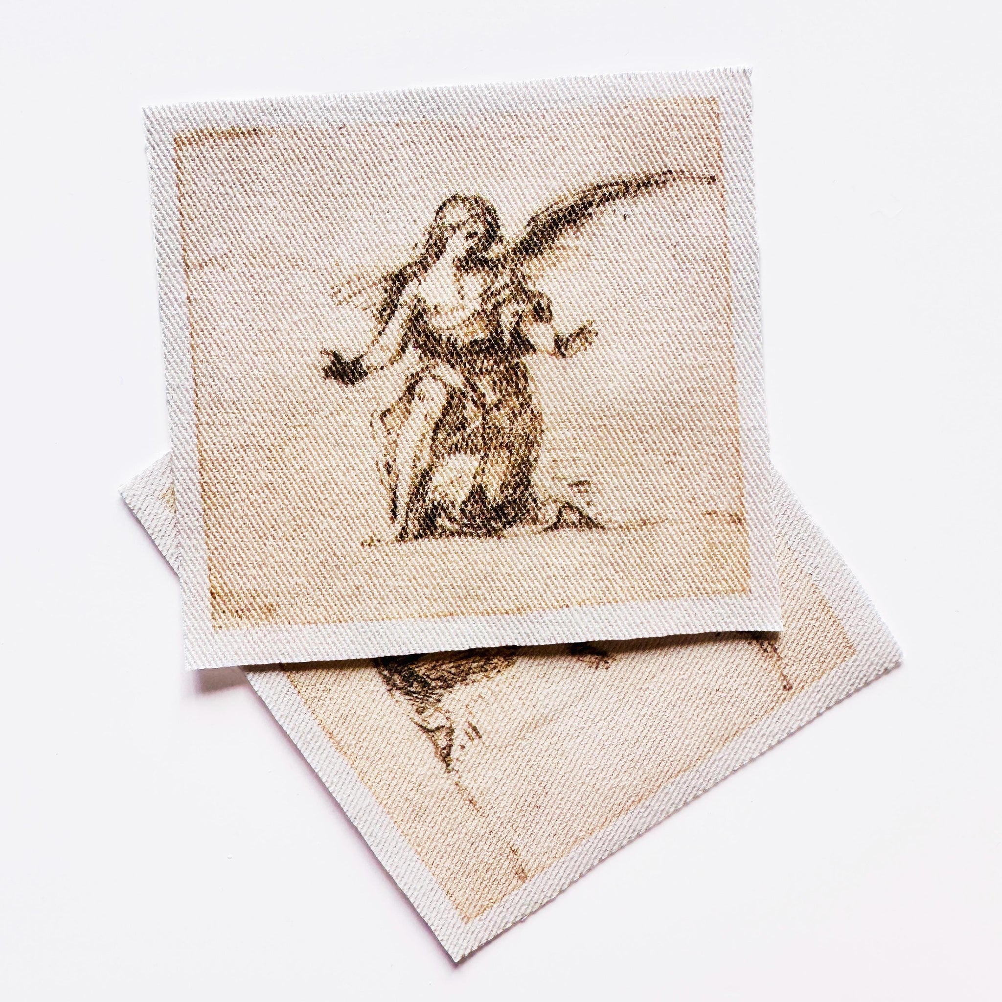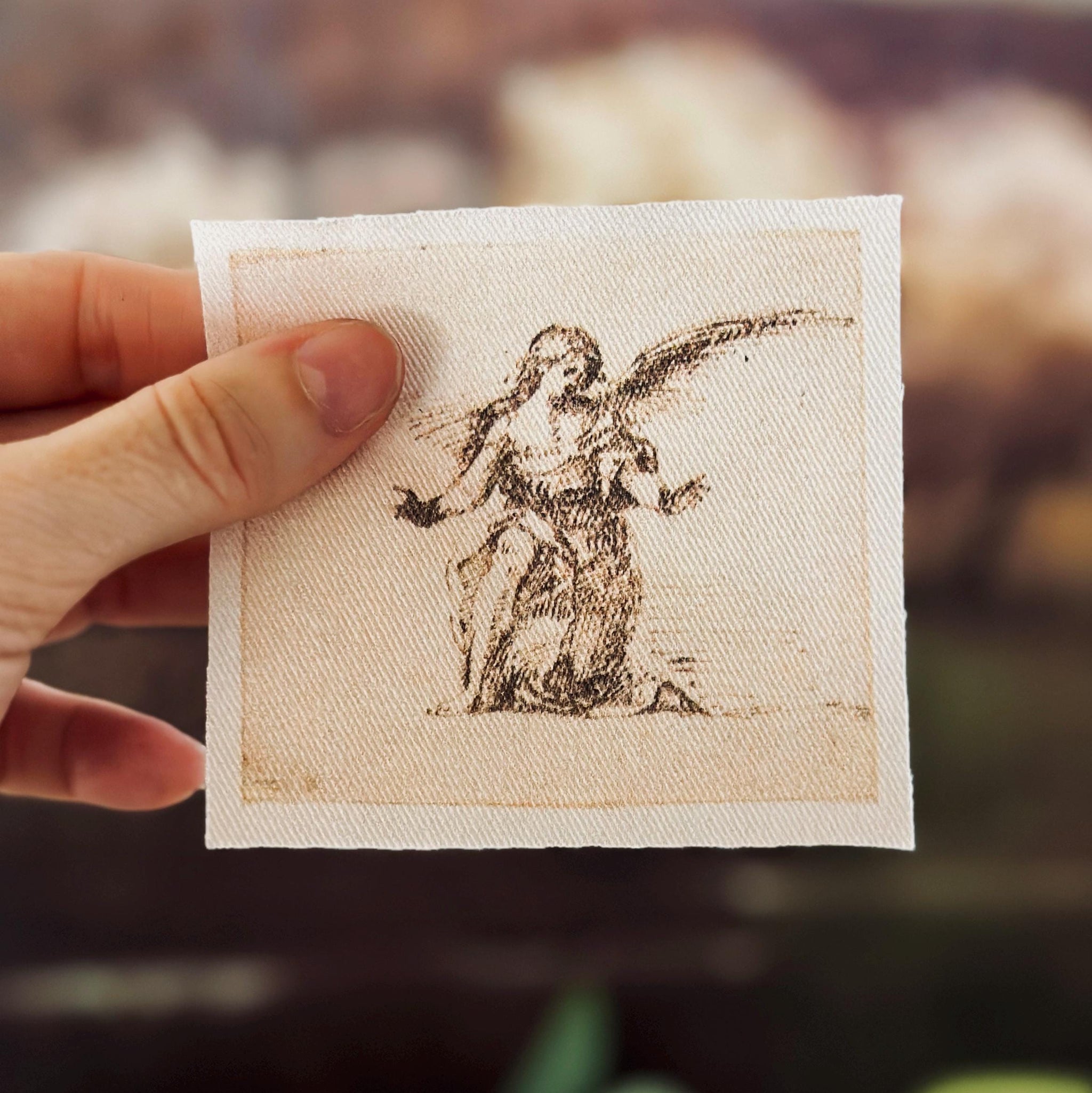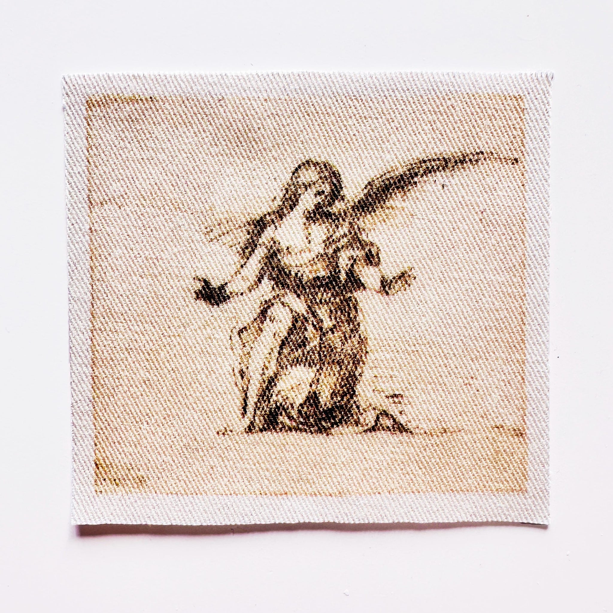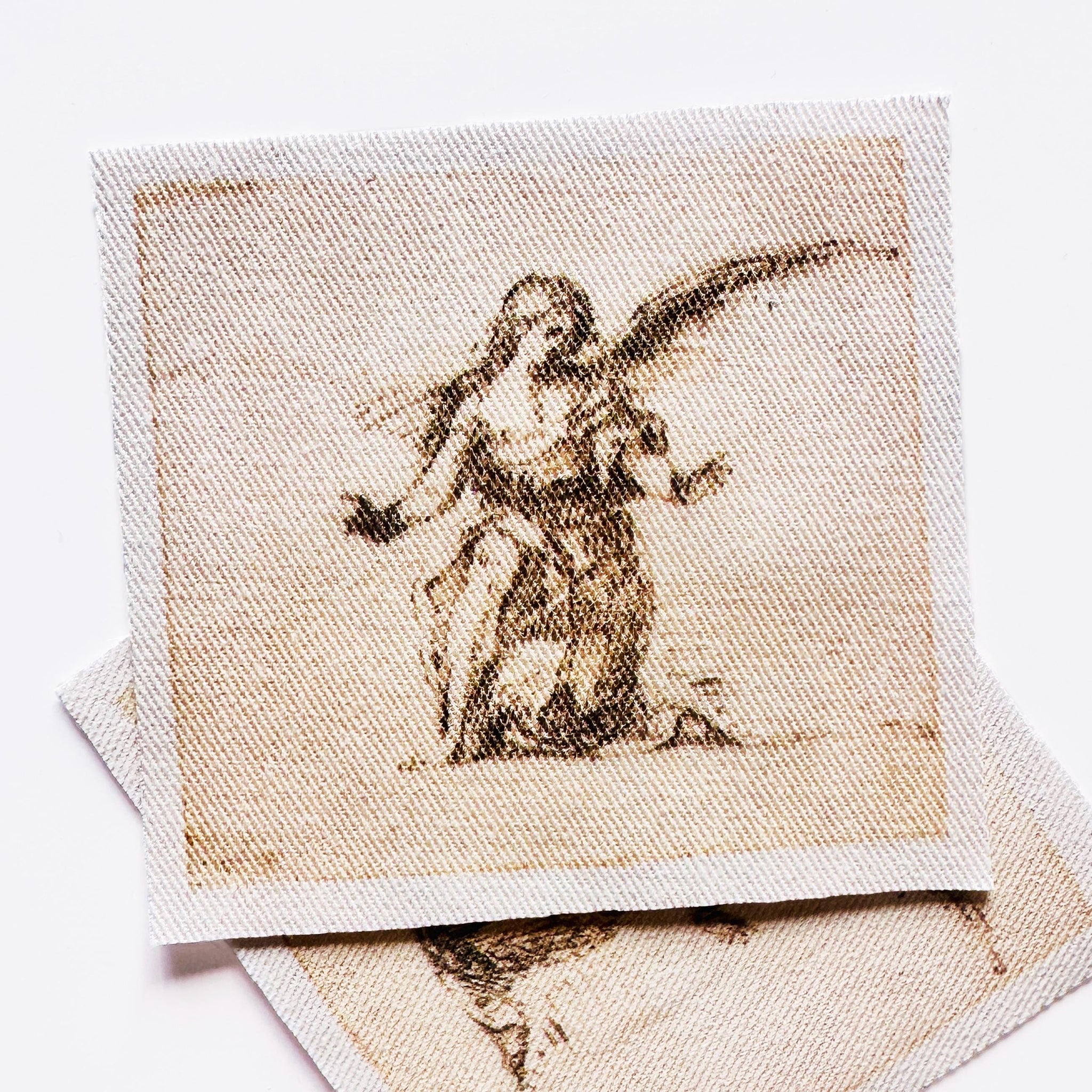 Add heavenly detail to your wardrobe or craft project with this beautiful Angel fabric patch, featuring an angel kneeling with her hands outstretched. The sketch is from the 17th century and was drawn by an unknown artist. Measuring 3.5x3.3", this DIY sew-on patch is perfect for adding classical art charm to jackets, bags, vests, and more.