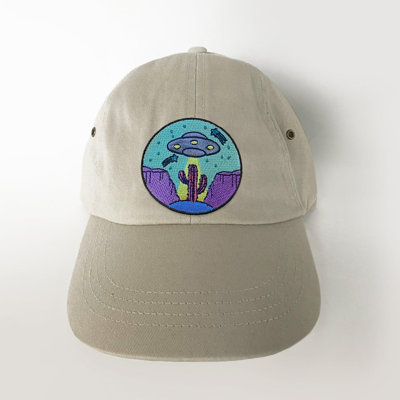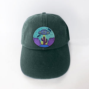 UFO Hat in your choice of color. The embroidered patch design features a desert and cactus scene. The low-profile dad-style baseball cap is one size to fit most adults.