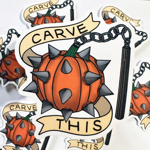 This is a decal sticker with a design of a Spiked Medieval Flail in the shape of a pumpkin. I drew this with a tattoo flash feel and a banner that reads: Carve This. This sticker is made of waterproof vinyl that can stick on most surfaces, including laptops, tumblers, windows, and more.