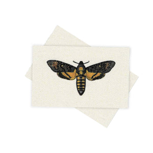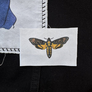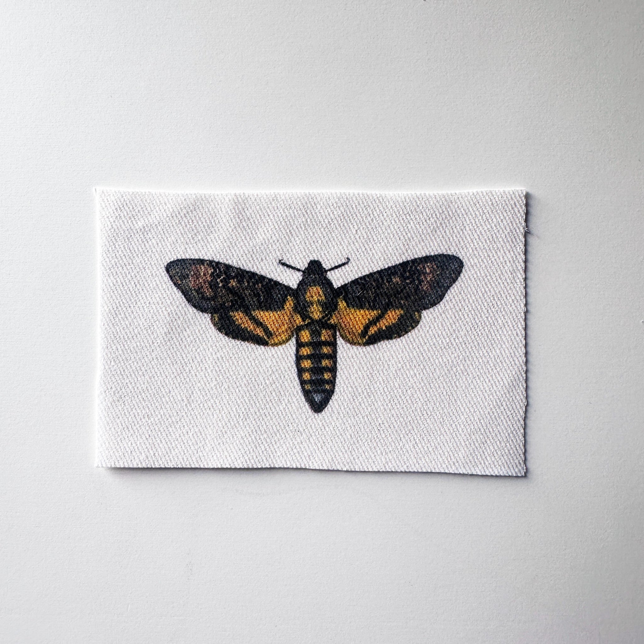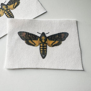 A diy printed patch for your jacket, vest, shirt, backpack, or bag. It will measure approximately 3.25x3.5". It features a Death's-head hawkmoth (Acherontia) moth in brown, yellow, and cream colors.