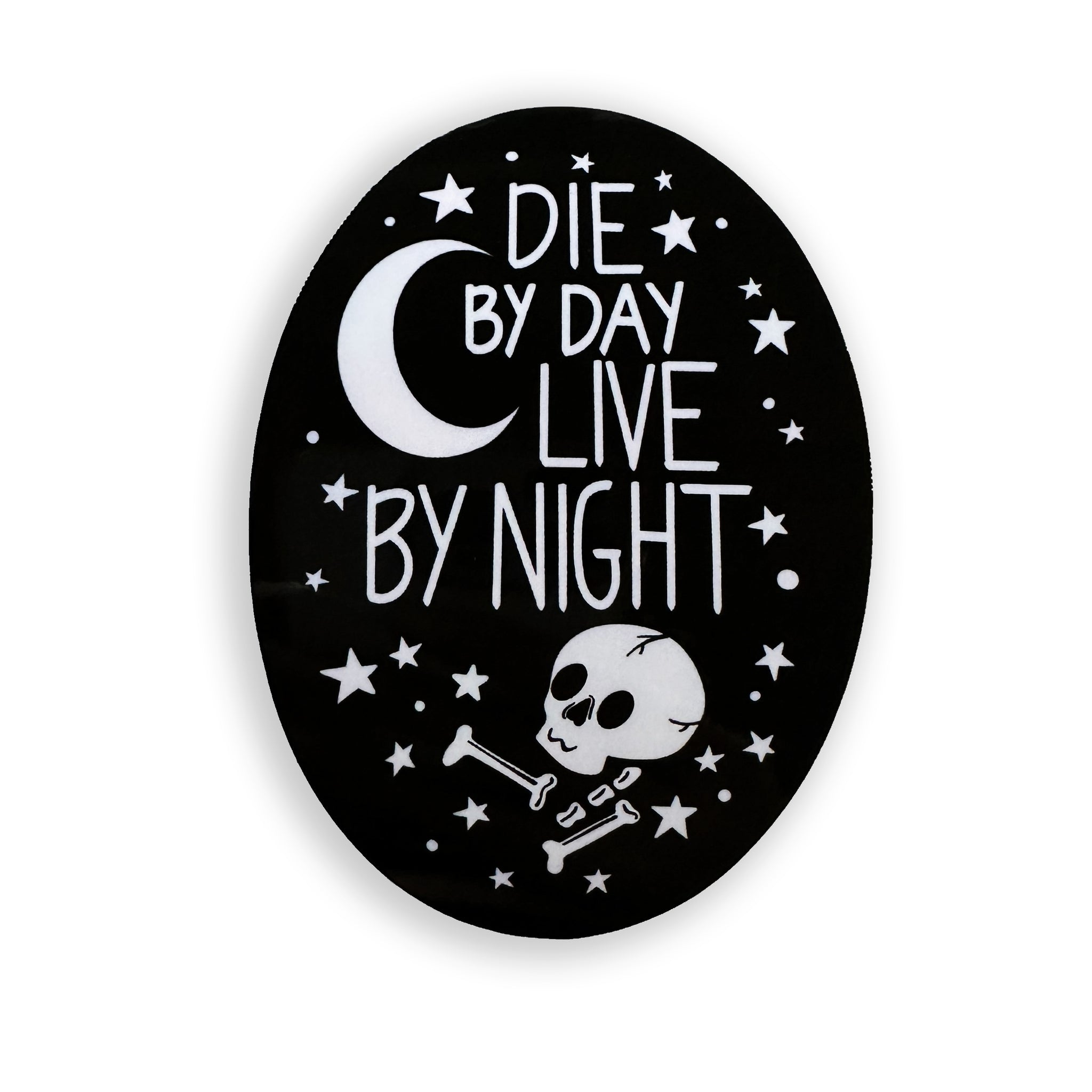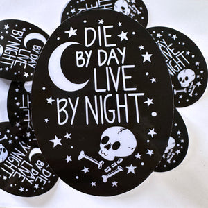 This is a vinyl sticker with a skull surrounded by stars in a black night sky. The text reads, "Die By Day Live By Night". This sticker is made of waterproof vinyl that can stick on most surfaces, including laptops, tumblers, windows, and more. Drawn and made by Espi Lane (me) it features a skull with its scattered skeleton remains basking in the moonlight. Perfect for boos and ghouls with a sense of humor that love Halloween and spooky things.