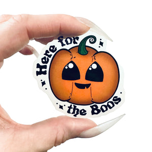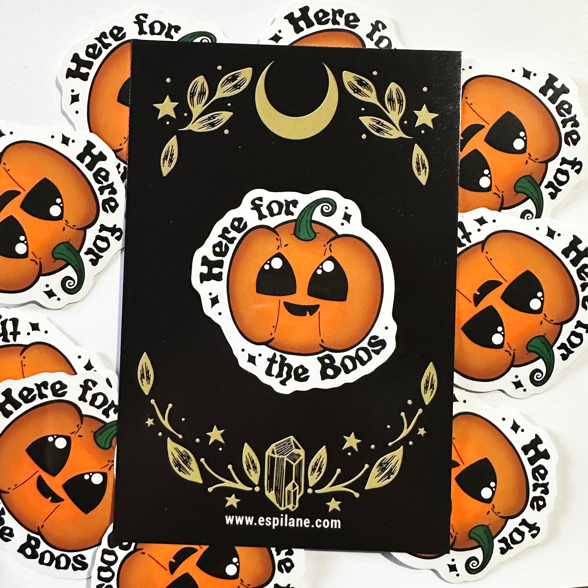 This is a decal sticker with a spooky cute pumpkin that reads: Here for the boos.Perfect for Halloween or lovers of things spoopy and ghoulish. This sticker is made of waterproof vinyl that can stick on most surfaces, including laptops, tumblers, windows, and more.