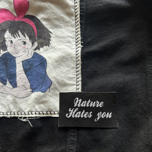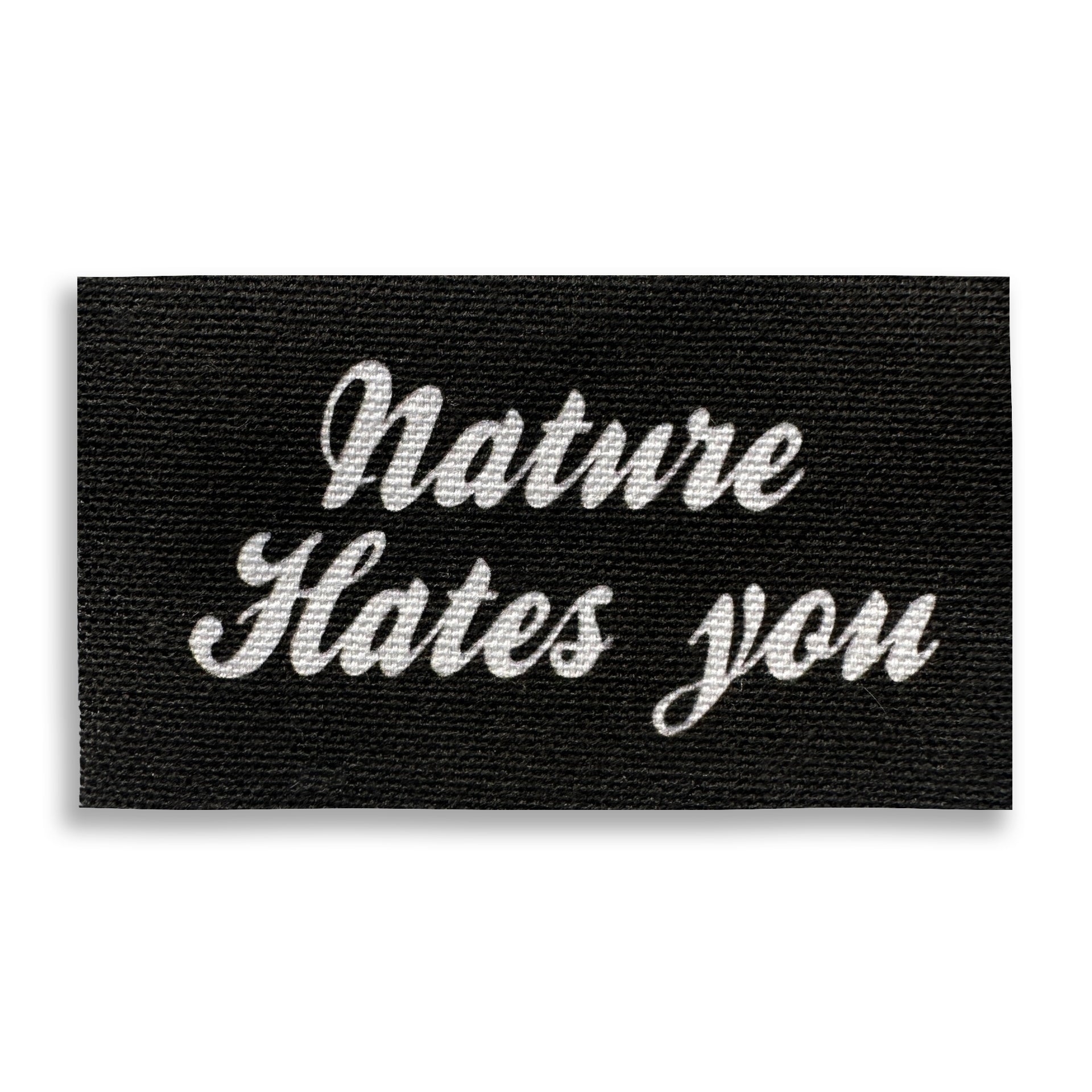 A patch for your jacket, vest, shirt, backpack, or bag. It will come rectangular in shape, and features text that reads, "Nature Hates You".