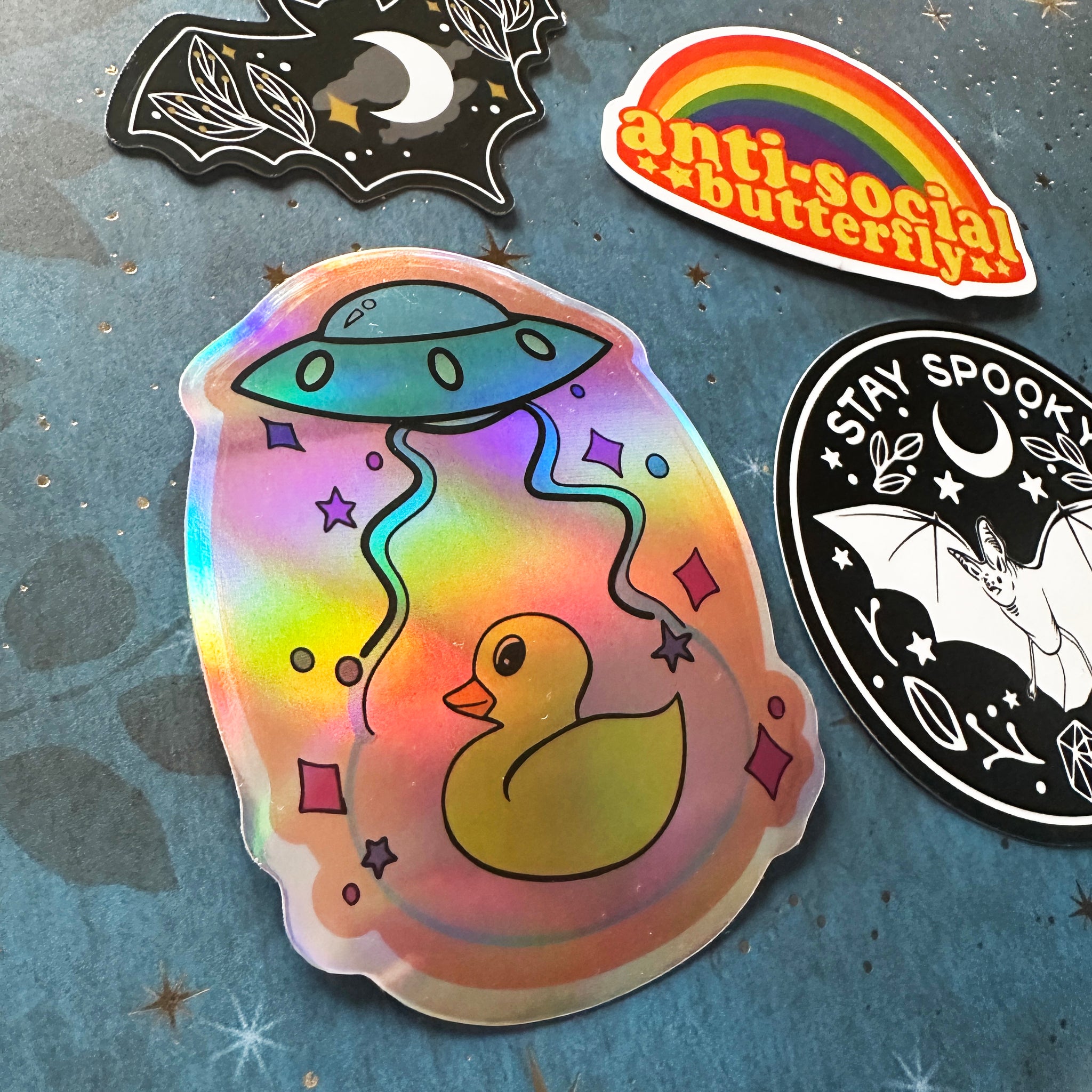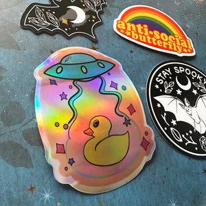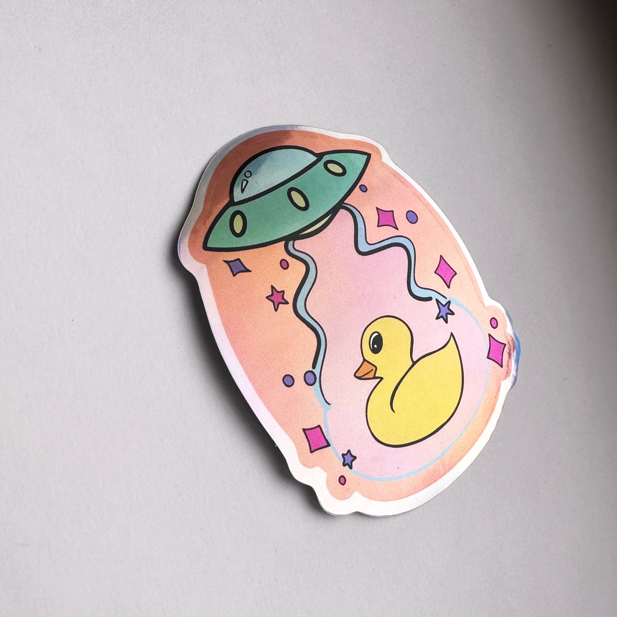 UFO Ducky Vinyl Sticker with original art by me. It's printed on strong holographic, waterproof vinyl with a glossy finish. This sticker works great on any surface like laptops, tumblers, stationary, or windows. Ships on a backer card to keep it safe.